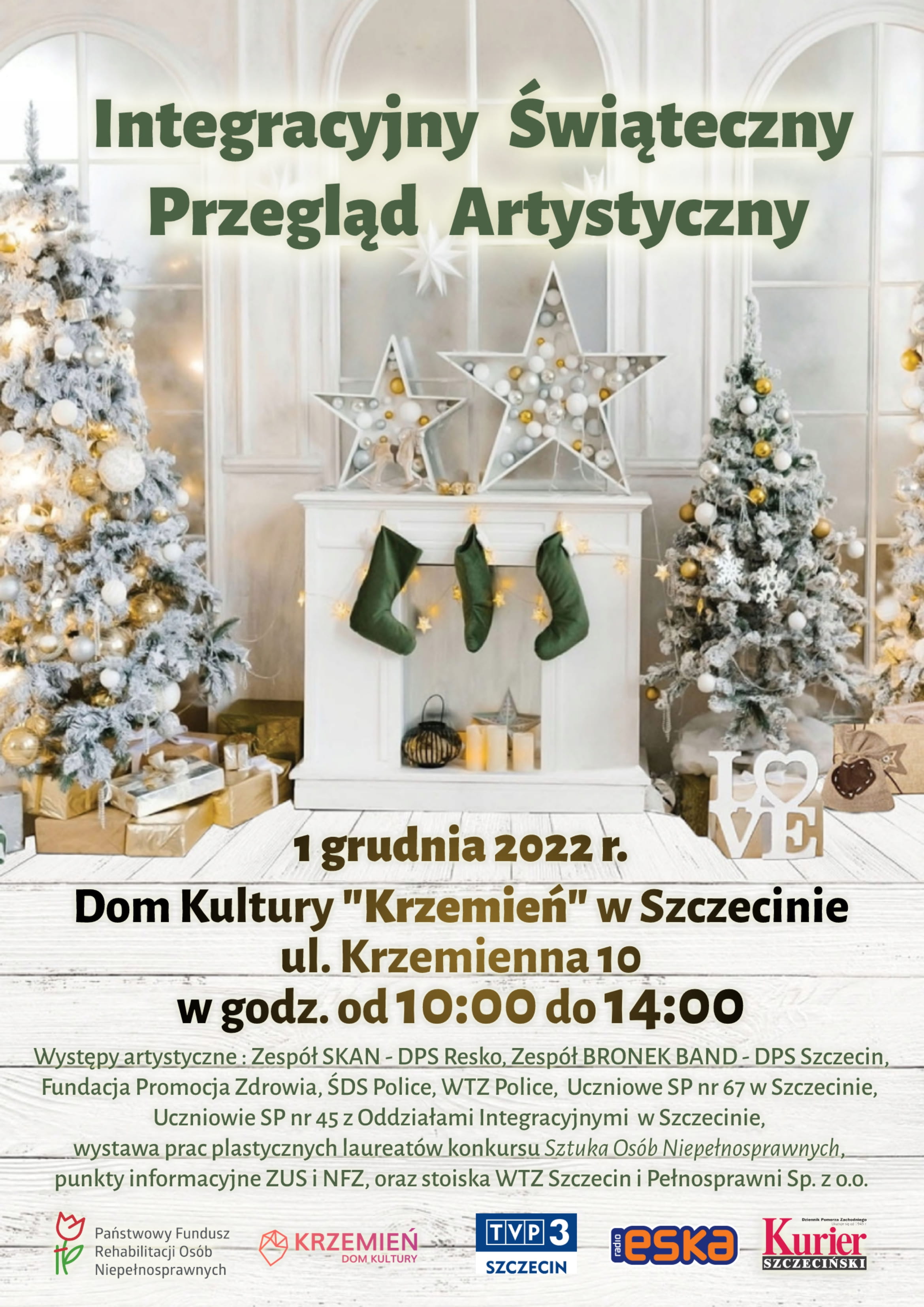 W trakcie „Integracyjnego Świątecznego Przeglądu Artystycznego” na scenie DK „Krzemień” zaprezentują się artyści z niepełnosprawnością z różnych placówek z województwa zachodniopomorskiego, min.: Zespół „Skan” z Domu Pomocy Społecznej w Resku, zespół „Bronek Band” z Domu Pomocy Społecznej w Szczecinie, uczniowie ze szczecińskich Szkół Podstawowych nr 45 i 67, soliści i instrumentaliści znajdujący się pod skrzydłami Fundacji Promocja Zdrowia, a także niesamowita para taneczna ze Środowiskowego Domu Samopomoc w Policach. Nie zabraknie również teatru „Recepta” z Kowalek, który zawsze w przystępny i obrazowy sposób porusza trudne tematy społeczne.