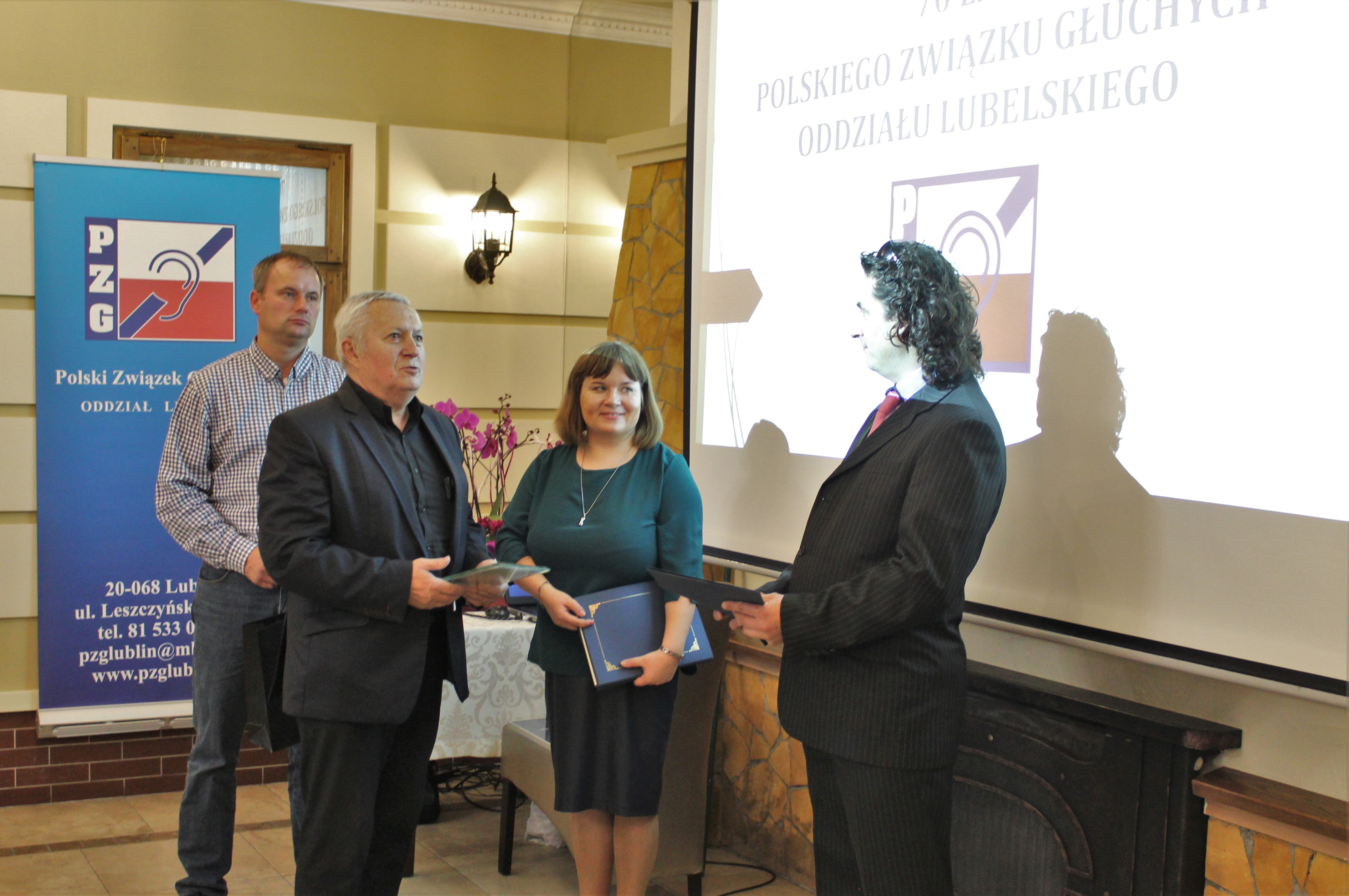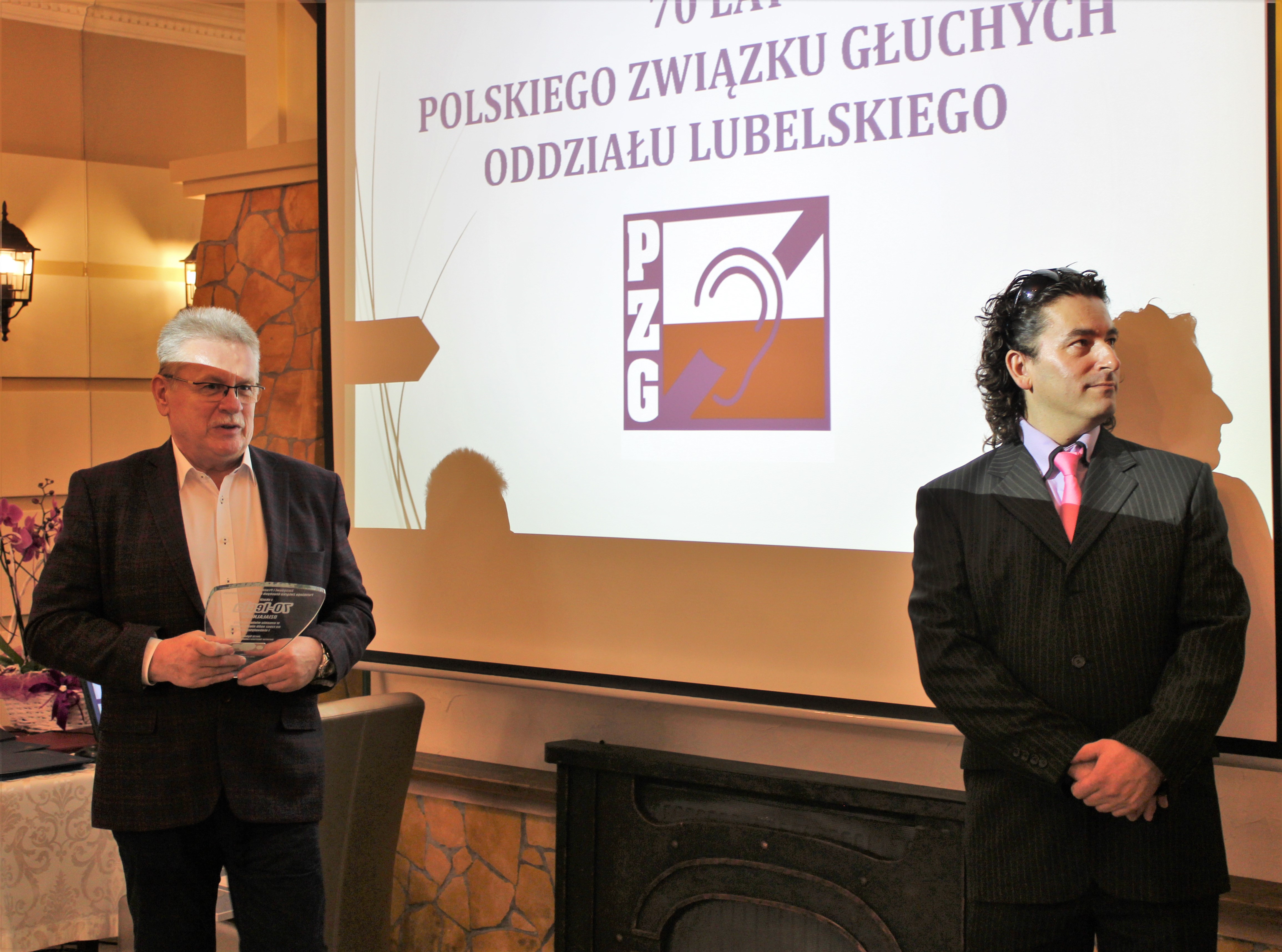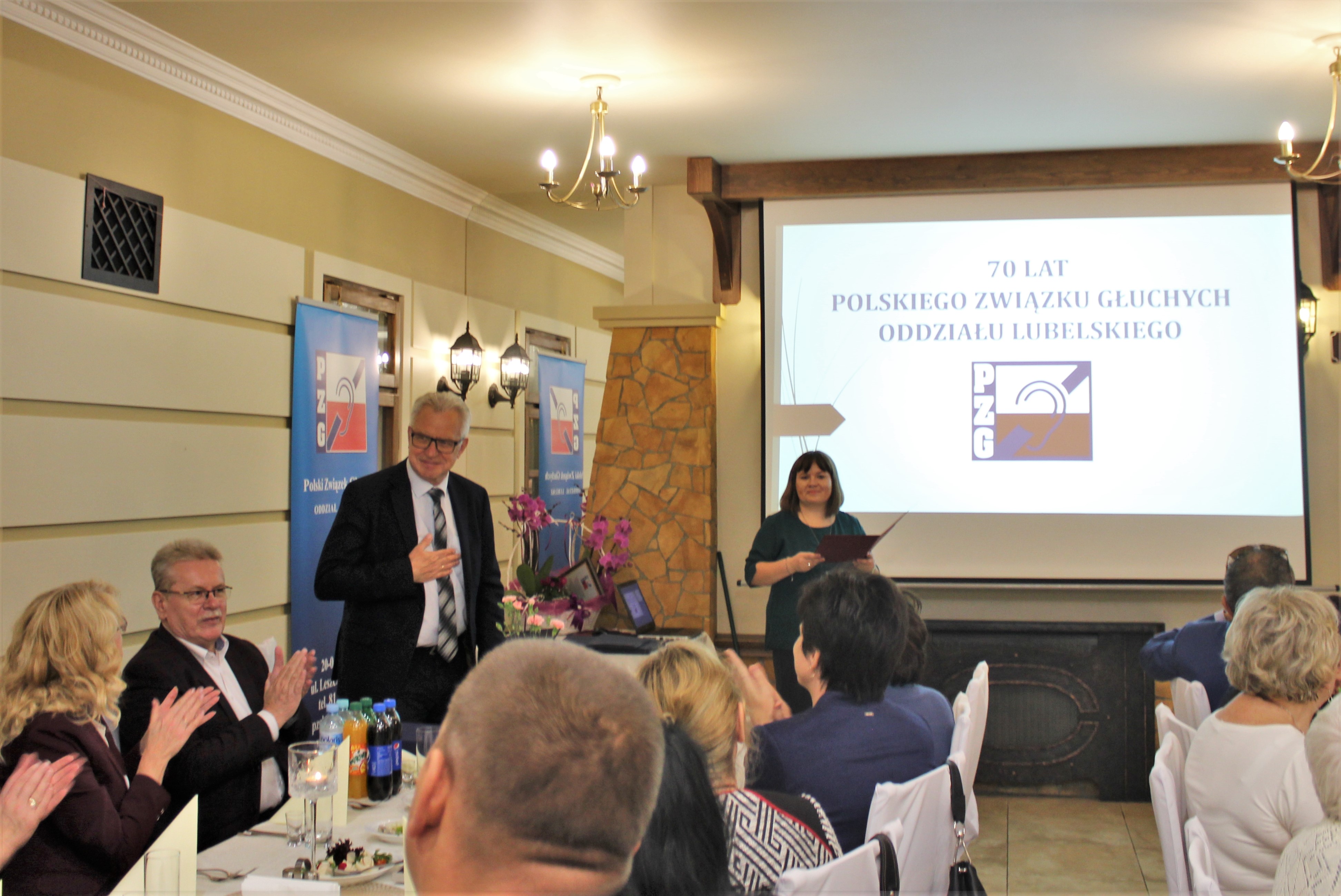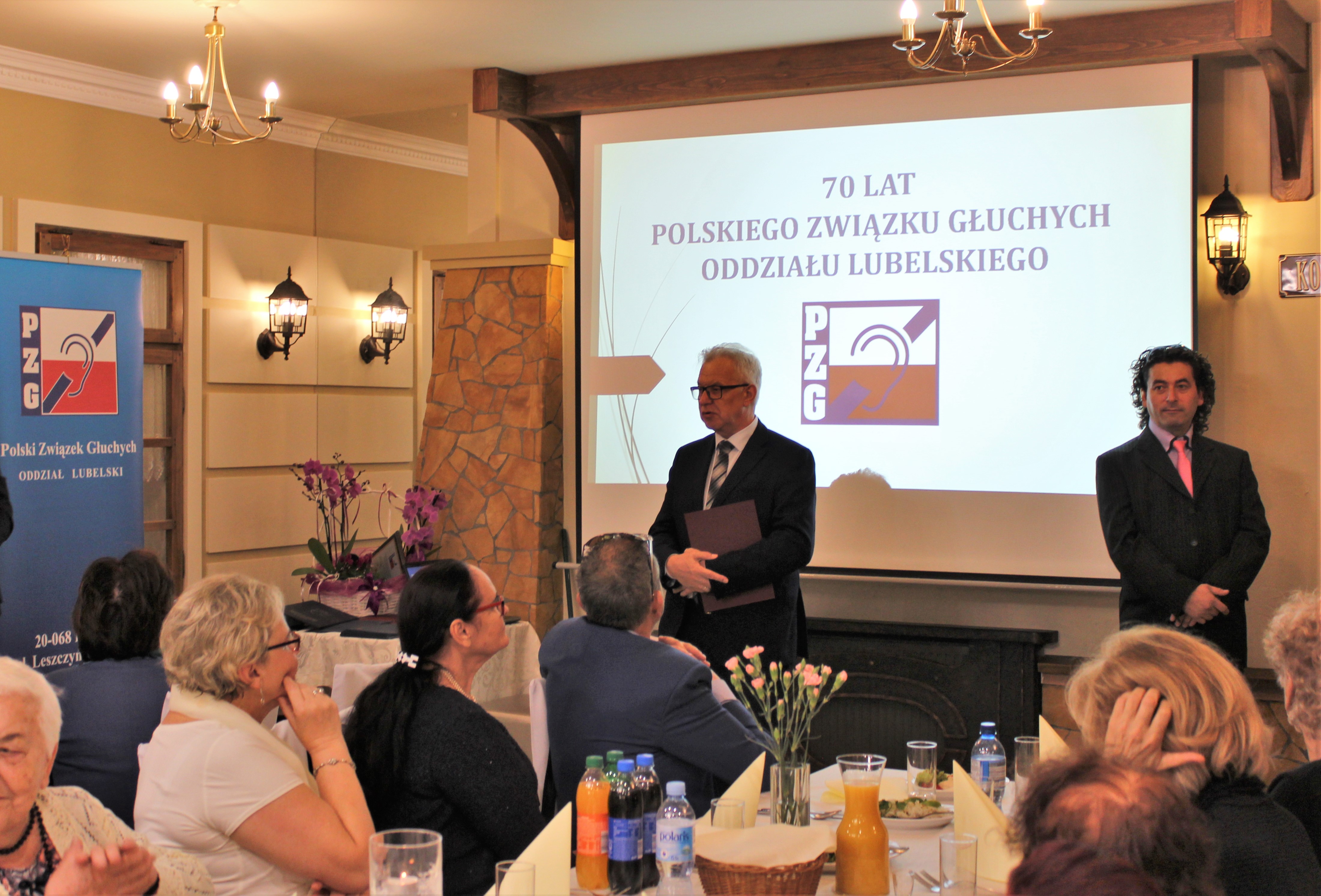 Wyrazy uznania oraz gratulacje z okazji jubileuszu złożył również Jerzy Dębski Dyrektor Oddziału Lubelskiego PFRON, podkreślając znaczenie wieloletniej współpracy ze Stowarzyszeniem oraz wartość działań podejmowanych przez nie na rzecz osób z niepełnosprawnością słuchu i mowy. Polski Związek Głuchych Oddział Lubelski powołany został w sierpniu 1949 roku i od początku swojego istnienia skupiał swoje działania na organizacji życia kulturalnego i promowania sportu wśród osób niesłyszących, ale również na inicjatywach edukacyjnych, mających przygotować osoby z niepełnosprawnością narządu słuchu do pracy oraz pełnego uczestnictwa w życiu społecznym. Współcześnie Stowarzyszenie prowadzi specjalistyczną rehabilitację osób głuchych i słabosłyszących w Terenowych Ośrodkach Rehabilitacji i Wsparcia Społecznego Niesłyszących PZG w Lublinie, Łukowie, Chełmie i Białej Podlaskiej.