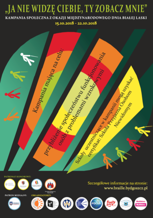 Organizatorami kampanii społecznej z okazji Międzynarodowego Dnia Białej Laski „JA NIE WIDZĘ CIEBIE, TY ZOBACZ MNIE!” jest Ośrodek Szkolno-Wychowawczy nr 1 dla Dzieci i Młodzieży Słabo Widzącej i Niewidomej im. L. Braille’a w Bydgoszczy oraz Stowarzyszenie Visus Supremus.