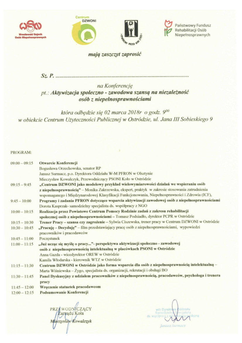 Mamy przyjemność poinformować, że 2 marca 2018 r. Warmińsko - Mazurski Oddział Państwowego Funduszu Rehabilitacji Osób Niepełnosprawnych wspólnie z Wrocławskim Sejmikiem Osób Niepełnosprawnych i Polskim Stowarzyszeniem Osób Niepełnosprawnych Intelektualnie Koło w Ostródzie organizuje konferencję pt. "Aktywizacja społeczno-zawodowa szansą na niezależność osób z niepełnosprawnościami".