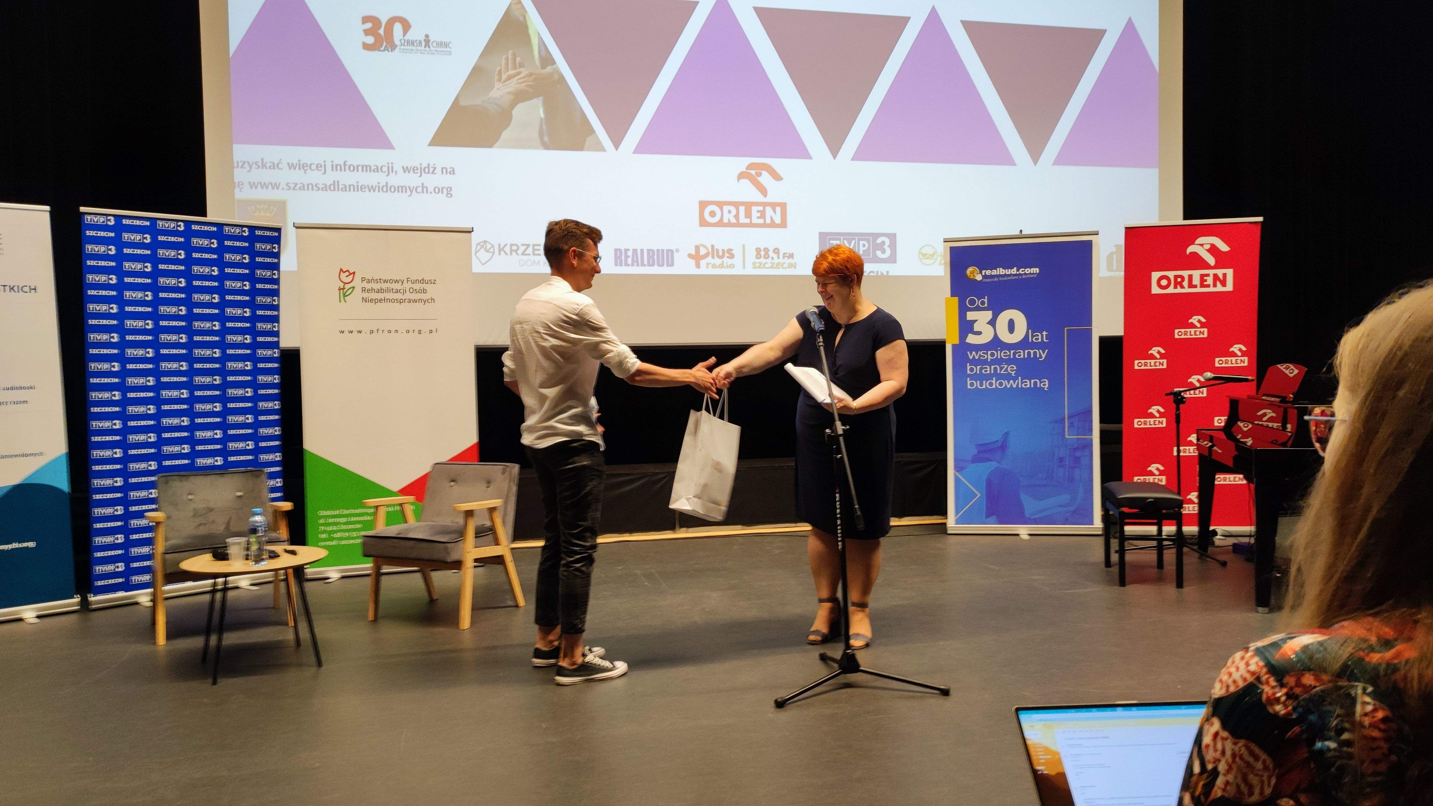 Spotkanie w Centrum Kultury „Krzemień” otworzył Pan Marek Kalbarczyk - Współzałożyciel Fundacji Szansa dla Niewidomych, wieloletni jej Społeczny Prezes, a obecnie Przewodniczący Rady Fundatorów. O działalności Fundacji i projekcie ,, Niepełnosprawni na otwartym rynku pracy” opowiedziała pani Malwina Wysocka - Dziuba, Prezes Fundacji Szansa dla Niewidomych.