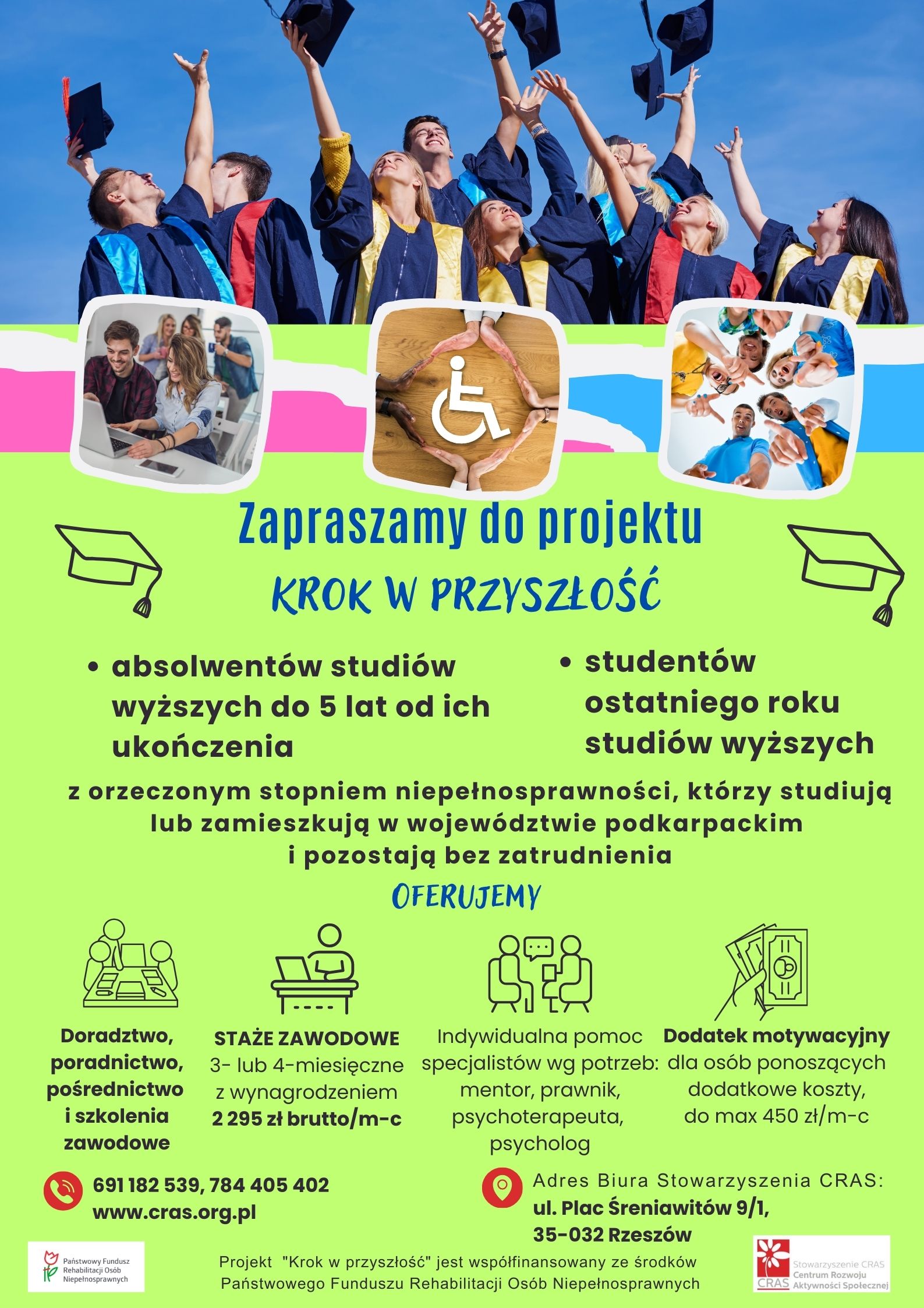 Stowarzyszenie „CRAS” realizuje projekt pn. „Krok w przyszłość”, w którym oferuje bezpłatne szkolenia zawodowe wg potrzeb oraz płatne 3 lub 4-miesięczne staże zawodowe. Projekt jest realizowany na podstawie umowy dofinansowania z PFRON w ramach pilotażowego programu „Absolwent”.