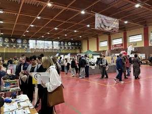 Ludzie odwiedzający stoiska instytucji podczas targów w hali sportowej.