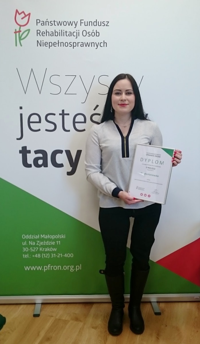 „Nagroda w konkursie „Otwarte Drzwi” jest dla mnie motywacją do dalszej pracy oraz niesienia pośredniej i bezpośredniej pomocy osobom z niepełnosprawnościami. Sama od kilku lat korzystam z pomocy innych, m.in. podczas studiów dużym wsparciem było dla mnie dofinansowanie jakie otrzymywałam z PFRON” – powiedziała w trakcie dzisiejszego spotkania w siedzibie Oddziału Małopolskiego Klaudia Kaniewska, laureatka II miejsca za pracę magisterską z zakresu rehabilitacji medycznej XIV edycji konkursu „Otwarte Drzwi”.