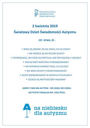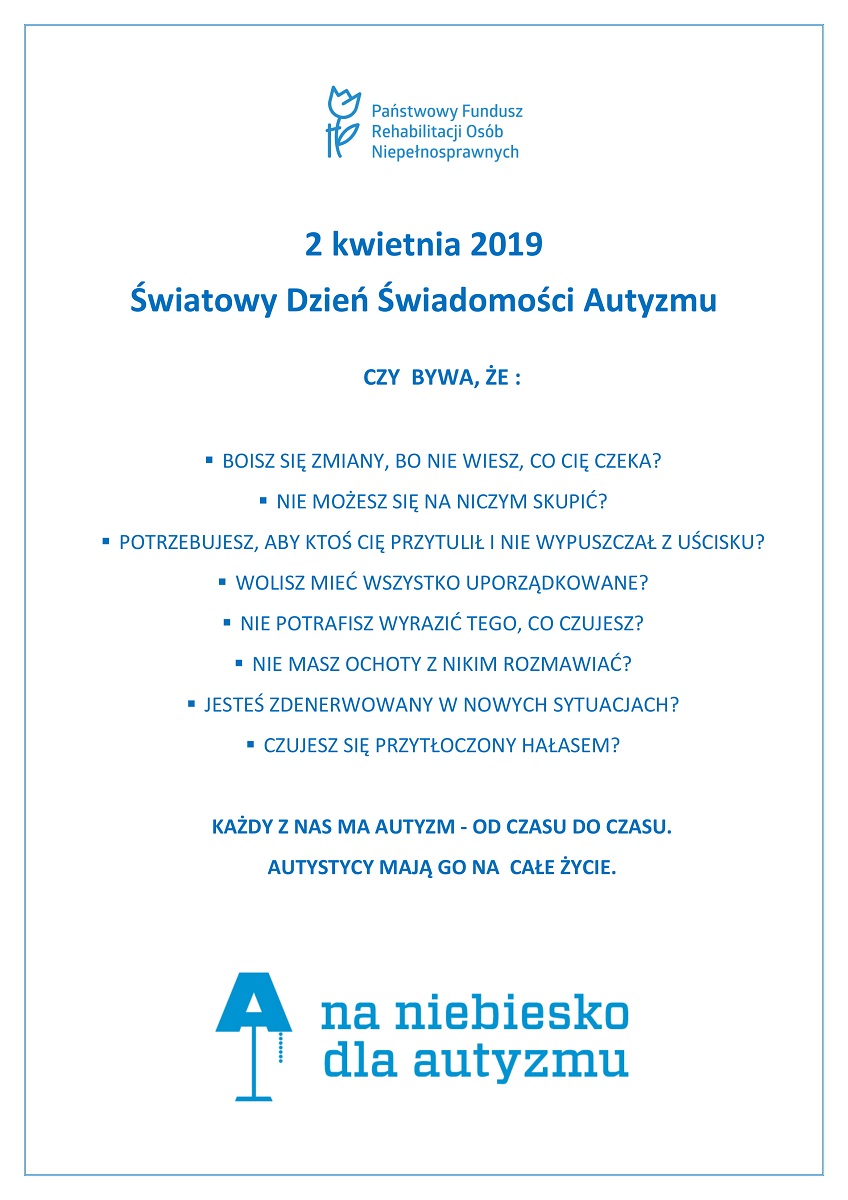 W dniu dzisiejszym Oddział Małopolski PFRON postawił na kolor niebieski! 2 kwietnia obchodzony jest Światowy Dzień Świadomości Autyzmu. Został ustanowiony w 2007 r. przez Zgromadzenie Ogólne ONZ z inicjatywy Kataru. Symbolem solidarności z osobami autystycznymi jest kolor niebieski, stąd pomysł globalnej akcji „Zaświeć się na niebiesko”. Tego dnia wiele budynków w Małopolsce, Krakowie jak i na całym świecie będzie oświetlona na niebiesko. Dziś nasze logo także stało się niebieskie.