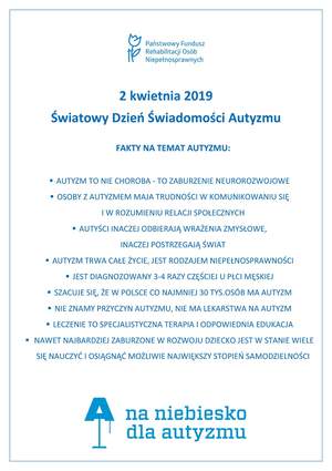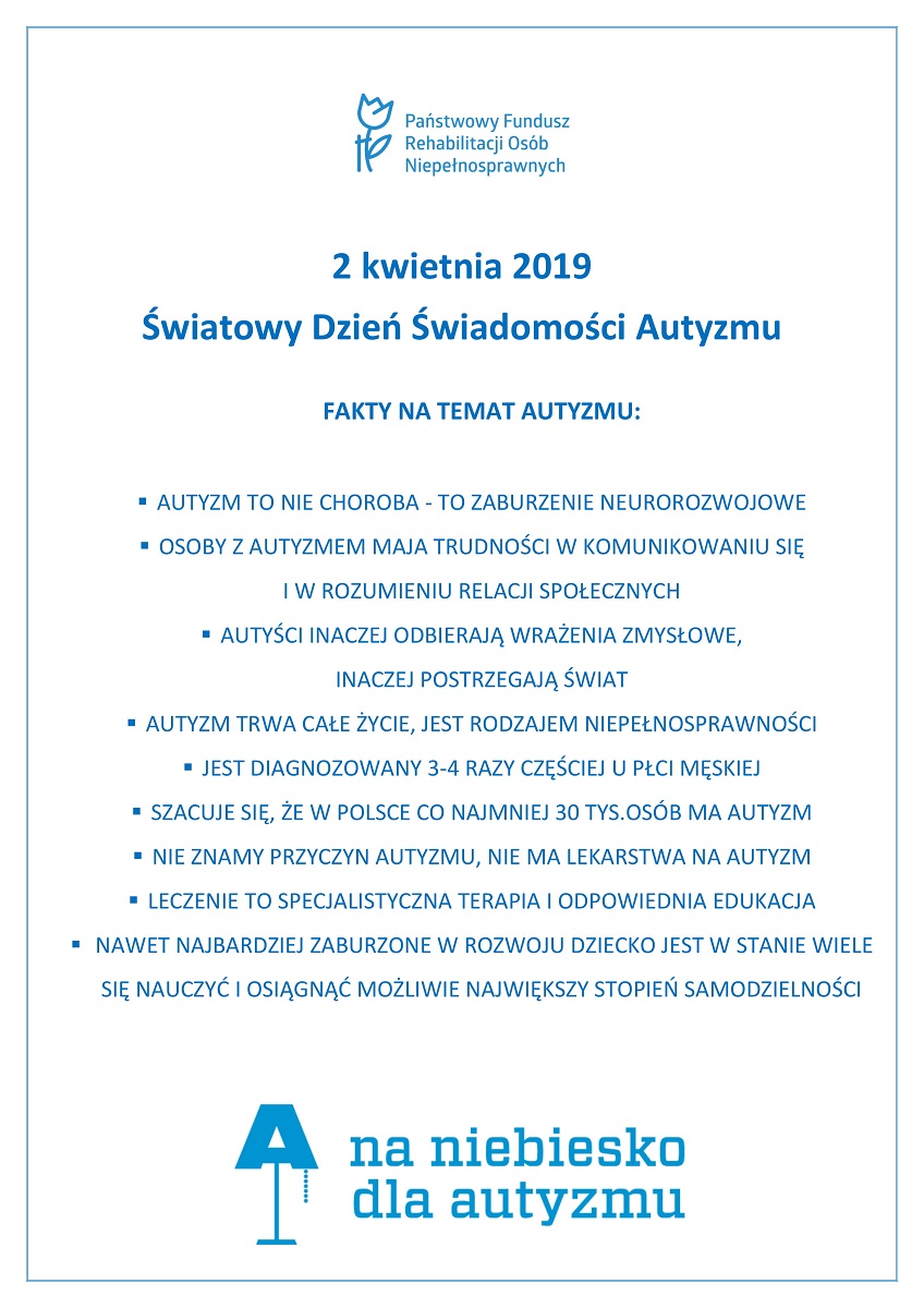 Przyjmuje się, że autyzm jest, obok m.in. chorób nowotworowych i cukrzycy, jednym z najpoważniejszych zdrowotnych zagrożeń cywilizacyjnych XXI wieku. Pamiętajmy, że nie jest chorobą, a zaburzeniem neurorozwojowym. Szacunkowo w Polsce autyzmem dotkniętych jest ponad 30 tys. osób, a zaburzenia ze spektrum ujawnią się u jednego na 80 urodzonych w tym roku dzieci, 3-4 razy częściej u płci męskiej. Prowadzone na świecie badania epidemiologiczne wskazują, że wciąż wzrasta odsetek dzieci z autyzmem. Nie znamy przyczyn autyzmu, leczenie to specjalistyczna terapia i odpowiednia edukacja. Nawet najbardziej zaburzone w rozwoju dziecko jest w stanie wiele się nauczyć i osiągnąć możliwie największy stopień samodzielności.