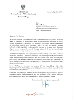 6 grudnia br., dzięki uprzejmości dyrektora Krzysztofa Głuchowskiego po raz kolejny w Teatrze im. Juliusza Słowackiego w Krakowie zaproszeni goście oraz organizatorzy wspólnie świętowali Dzień Osób Niepełnosprawnych. Uroczystość miała szczególny charakter ze względu na obchodzone w tym dniu Mikołajki. Z tej okazji Marta Mordarska – dyrektor Małopolskiego Oddziału PFRON, zaproszeni goście oraz aktorzy obdarowali obecne na spektaklu „SMOK!” dzieci i młodzież upominkami przygotowanymi przez Oddział PFRON. W spektaklu uczestniczyli m.in. podopieczni Specjalnego Ośrodka Szkolno - Wychowawczego im. Jana Pawła II w Krakowie oraz Zespołu Szkół i Placówek pn. „Centrum dla Niewidomych i Słabowidzących”.