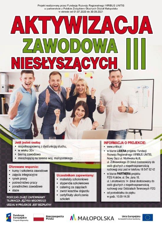 Oddział Małopolski PFRON zawarł już drugą w tym roku umowę w ramach programu "Partnerstwo dla Osób z Niepełnosprawnościami". Dofinansowanie w wysokości 20 996,41 zł dotyczy projektu realizowanego przez Fundację Rozwoju Regionalnego VIRIBUS UNITIS z Nowego Sącza. Projekt pod nazwą "Aktywizacja Zawodowa Niesłyszących III" realizowany jest w partnerstwie z Polskim Związkiem Głuchych – Oddziałem Małopolskim w Krakowie. Wsparcie otrzyma 28 osób niesłyszących. Instytucją organizująca konkurs jest w tym przypadku Wojewódzki Urząd Pracy w Krakowie.
