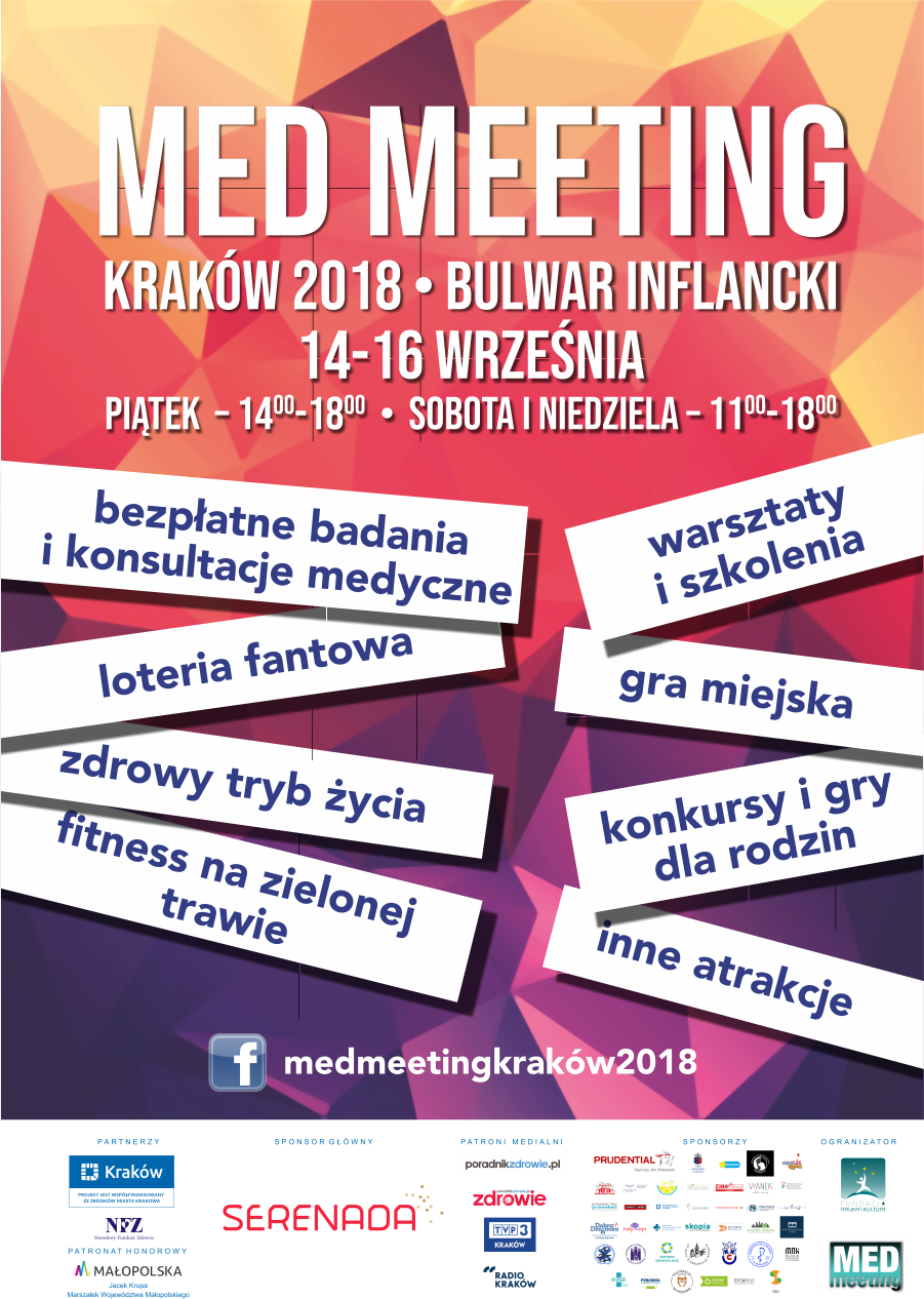 Fundacja Nauka i Kultura oraz Oddział Małopolski PFRON zapraszają na Med Meeting Kraków 2018, który odbędzie się w dniach 14-16.09.2018 r. na Bulwarze Inflanckim. Będzie tam można spotkać lekarzy oraz specjalistów udzielających porad, konsultacji oraz wykonać bezpłatne badania. W programie znajdą się także warsztaty pierwszej pomocy, zajęcia fitness na zielonej trawie, zajęcia z psami przewodnikami, aktywny pokaz dogoterapii, warsztaty terapii kwiatami, warsztaty neuro fitnessu, spotkania z dietetykami, terapeutami, psychologami oraz wiele innych atrakcji.