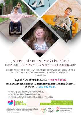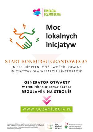 Fundacja „Oczami Brata” została liderem projektu „Moc lokalnych inicjatyw” dla V makroregionu, obejmującego województwo: śląskie i świętokrzyskie. Do rozdysponowania jest 1482 700.00 zł. Głównym celem konkursu jest wsparcie na poziomie lokalnym osób z niepełnosprawnościami i ich otoczenia. Dodatkowymi celami konkursu są: wzmocnienie samostanowienia, niezależności i aktywności obywatelskiej osób z niepełnosprawnościami poprzez umożliwienie realizacji oddolnych inicjatyw;- prowadzenie działań o charakterze edukacyjnym i animacyjnym, których celem jest pobudzanie środowiska osób z niepełnosprawnościami i ich otoczenia do zrzeszania się, aktywnego działania w środowisku lokalnym, tworzenia i rozwijania organizacji pozarządowych. Zachęcamy wszystkie stowarzyszenia, szczególnie te małe, od niedawna działające na rzecz osób z niepełnosprawnościami do składania wniosków w generatorze znajdującym się na stronie Fundacji. Ten projekt jest właśnie dla was. Więcej szczegółów w Fundacji Oczami Brata pod numerami telefonów: 533-527-368, 788-448-039