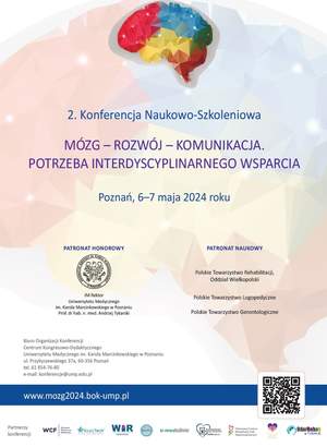 W dniach 6 i 7 maja 2024 roku Uniwersytet Medyczny w Poznaniu organizuje II Konferencję Naukowo-Szkoleniową zatytułowaną „Mózg - rozwój - komunikacja. Potrzeba interdyscyplinarnego wsparcia”. Poszczególni prelegenci wygłoszą swoje referaty zarówno w Centrum Kongresowo-Dydaktycznym Uniwersytetu Medycznego w Poznaniu przy ul. Przybyszewskiego 37a, jak i w Centrum Biologii Medycznej Uniwersytetu Medycznego w Poznaniu przy ul. Rokietnickiej 8.