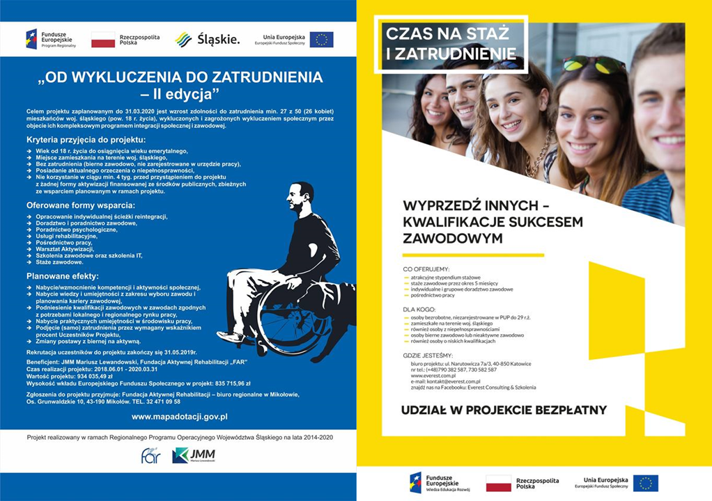 Oddział Śląski PFRON informuje o aktualnie prowadzonych naborach w ramach realizowanych projektów europejskich ze środków unijnych na terenie województwa śląskiego. Szczegółowe informacje oraz formularze zgłoszeniowe znajdują się w odnośnikach do stron internetowych. Poniższe projekty realizowane są m.in. przez: Fundację Aktywnej Rehabilitacji, Ochotnicze Hufce Pracy, Śląską Akademię Nauki i Rozwoju. Głównym celem projektów jest zwiększenie zatrudnienia m.in. poprzez: doradztwo zawodowe, szkolenia, pośrednictwo pracy, wsparcie psychologa oraz staże.