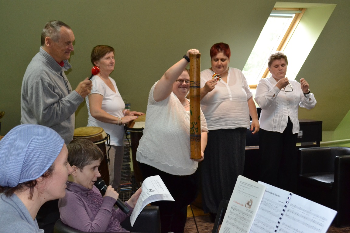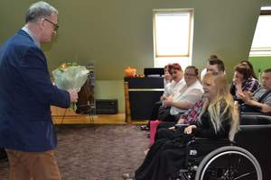 Przed uroczystym wręczeniem nagród gospodarz Warsztatów Terapii Zajęciowej Radosław Kaczmarczyk zaprosił zgromadzonych gości do wysłuchania repertuaru przygotowanego przez zespół KORZENIE działający przy WTZ „Zielone Wzgórze”.