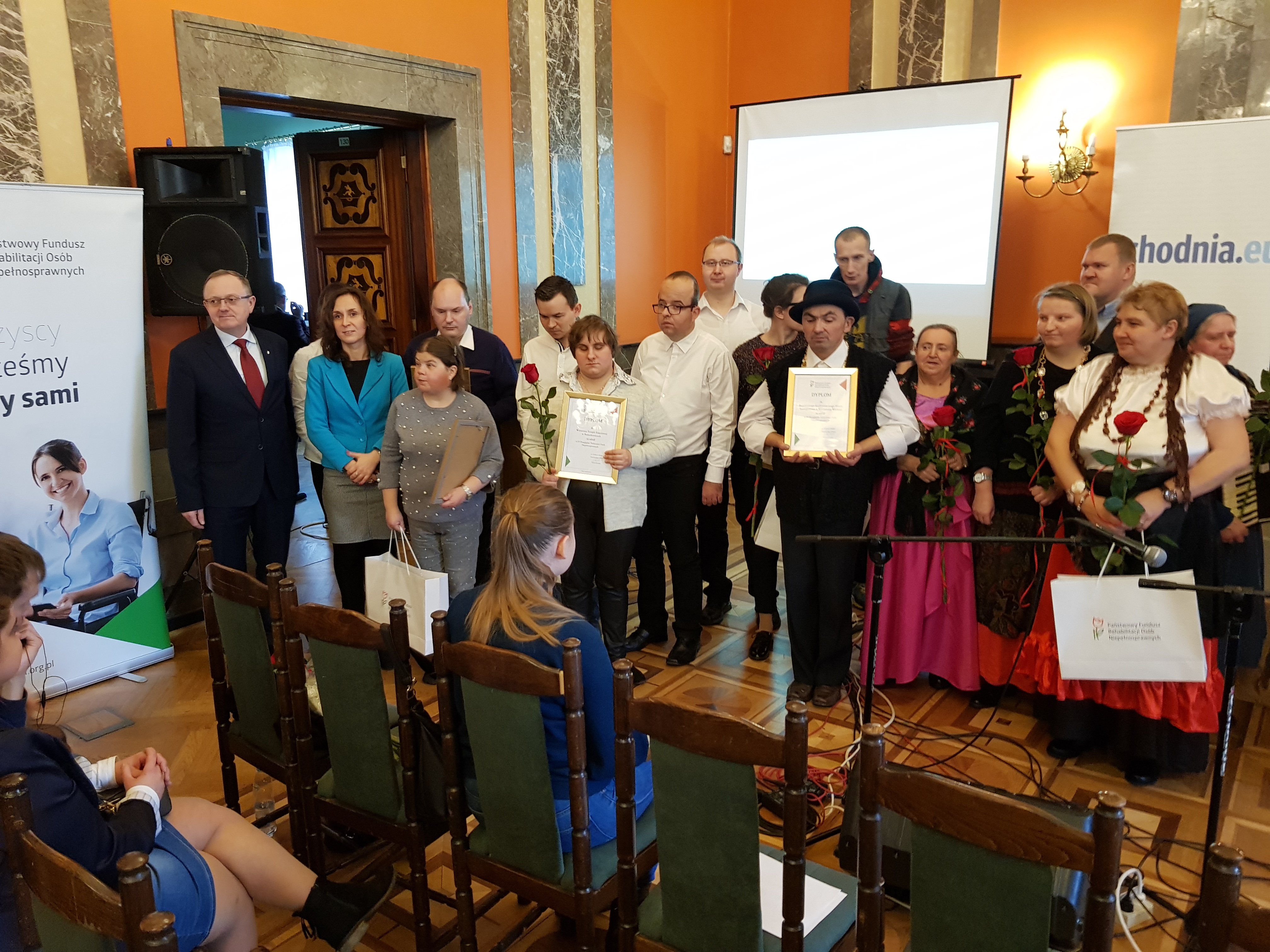 Statuetki, dyplomy i nagrody rzeczowe laureatom wręczał Andrzej Michalski- dyrektor Oddziału Świętokrzyskiego PFRON wraz z zaproszonymi gośćmi: starosta powiatu kieleckiego- Stefan Bąk, przedstawiciel MOPR w Kielcach- Iwona Duda oraz pan Arkadiusz Ślipikowski -z-ca dyrektora Regionalnego Ośrodka Pomocy Społecznej.