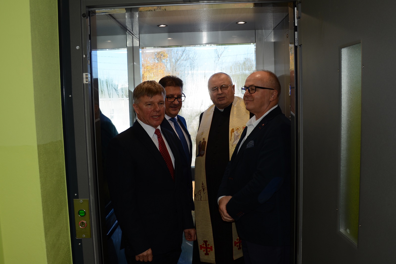 W uroczystym wydarzeniu oddania windy wzięli udział m.in.: Adam Świniuch i Wojciech Brzeski – członkowie zarządu powiatu zgierskiego, Maria Miśkiewicz – dyrektor PCPR w Zgierzu, Beata Szafarz – PCPR, Jarosław Madaj – przedstawiciel Oddziału Łódzkiego PFRON, Radosław Zaborowski – Urząd Miasta i Gminy Stryków, ksiądz Stanisław Banach – proboszcz głowieńskiej parafii oraz osoby zaangażowane w powstanie tej inwestycji.