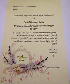 W pierwszym dniu kalendarzowej wiosny licznie zgromadzeni goście, w tym także pracownicy Kujawsko - Pomorskiego Oddziału PFRON, uczestniczyli w uroczystych obchodach Światowego Dnia Zespołu Downa, zorganizowanych przez Towarzystwo Przyjaciół Downa w Grudziądzu. Impreza miała miejsce w Hotelu IBIS w Grudziądzu. Gości na wejściu „częstowano” kolorowymi skarpetkami, które stanowią symbol solidarności z osobami z zespołem Downa.