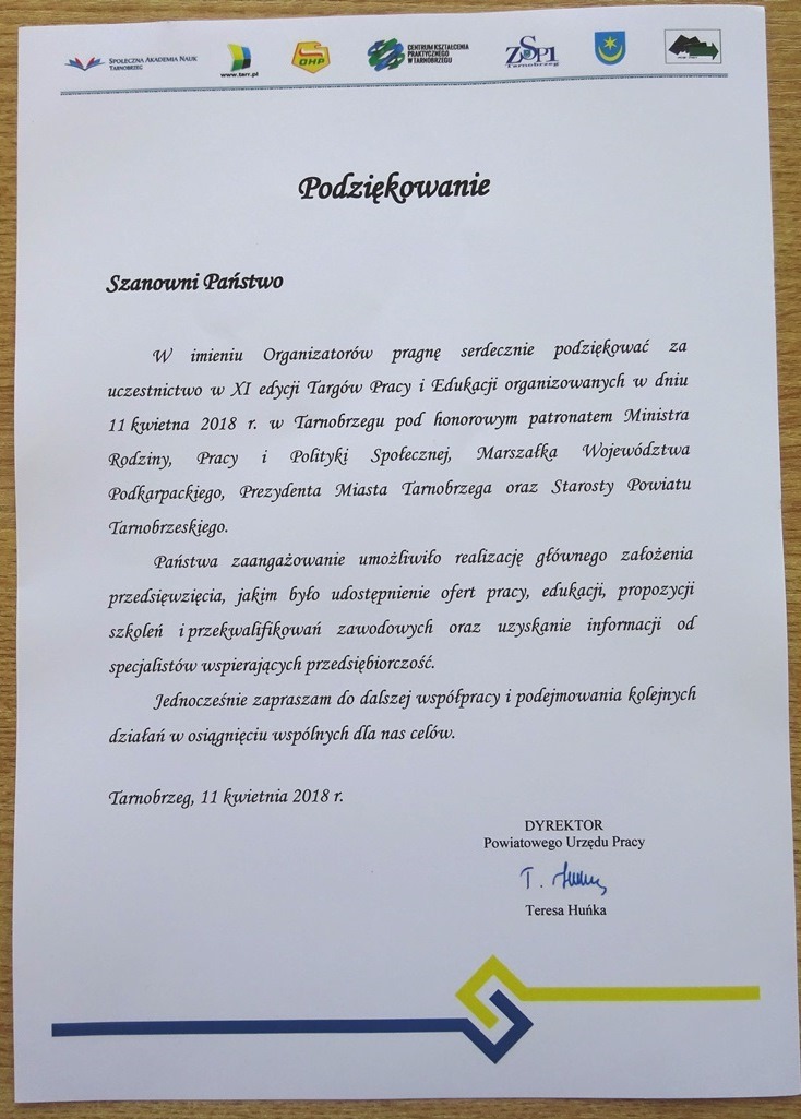 w Targach Pracy i Edukacji – XI edycja - organizowanych przez Powiatowy Urząd Pracy w Tarnobrzegu. Miały one miejsce w Hali Widowiskowo-Sportowej MOSiR.
