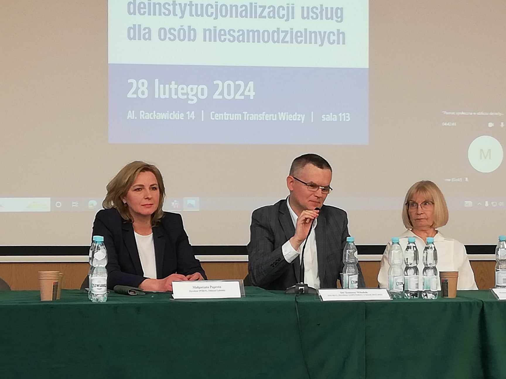 Wydarzenie zgromadziło liczne grono prelegentów, wśród nich była Małgorzata Paprota Dyrektor Oddziału Lubelskiego PFRON. Pani Dyrektor wzięła udział w dyskusji panelowej na temat szans i zagrożeń deinstytucjonalizacji z perspektywy praktyków. Przedstawiła możliwości działań proponowanych przez PFRON w zakresie deinstytucjonalizacji usług społecznych, oferowanego wsparcia dla osób z niepełnosprawnościami i ich rodzin. Deinstytucjonalizacja umożliwia przechodzenie od opieki o charakterze instytucjonalnym do opieki świadczonej w środowisku rodzinnym i społeczności lokalnej. Dotyczy ona osób z niepełnosprawnościami, starszych, rodzin, dzieci i młodzieży w ramach pieczy zastępczej, osób z problemami zdrowia psychicznego oraz w kryzysie bezdomności. Deinstytucjonalizacja realizowana jest na różne sposoby: przez asystentów osobistych, wspomagane społeczności mieszkaniowe, wypożyczalnie sprzętu rehabilitacyjnego. Dzięki temu osoby wymagające szczególnej troski będą mogły tak długo, jak zechcą bezpiecznie i niezależnie funkcjonować w swoim miejscu zamieszkania.