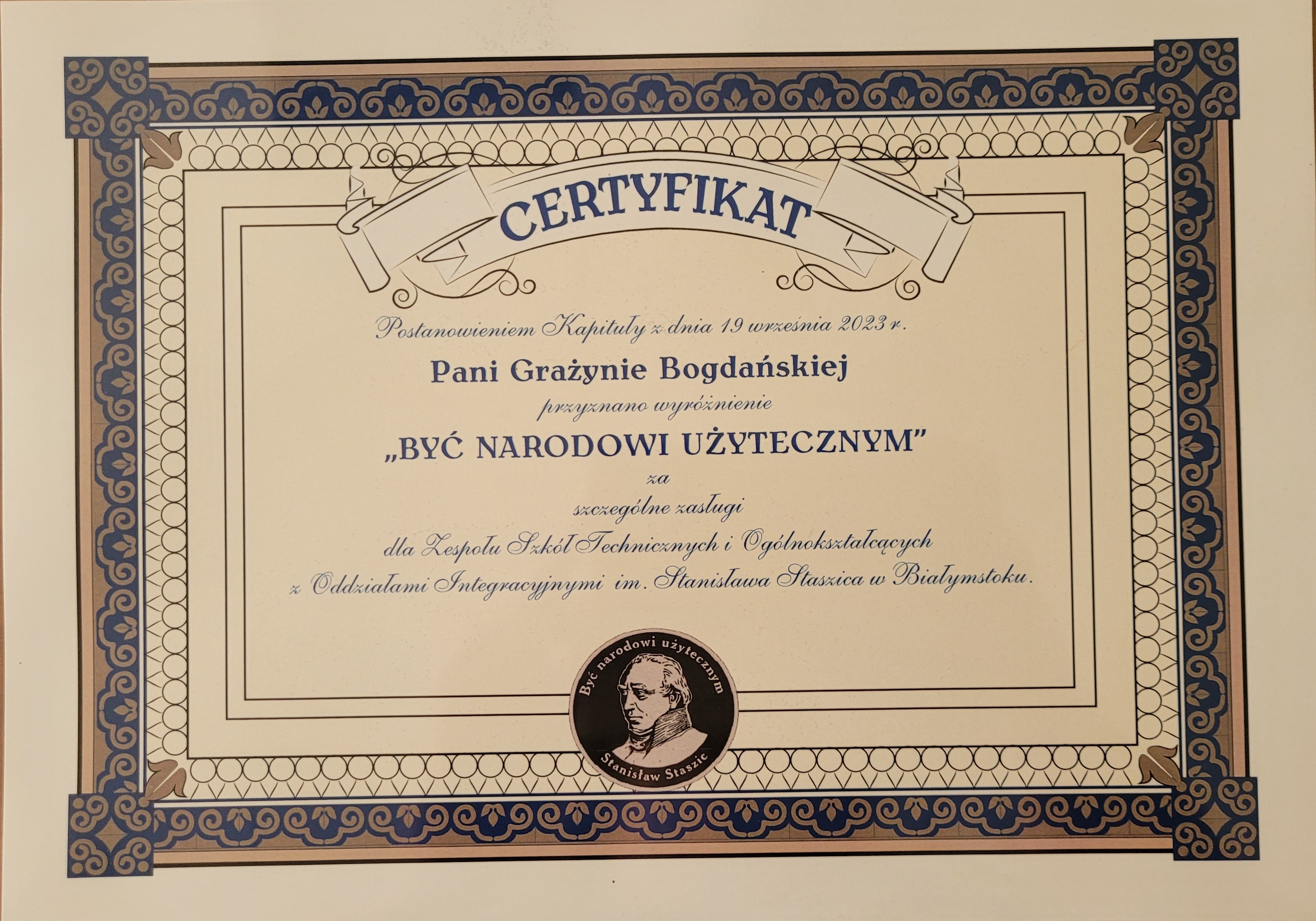 W trakcie wydarzenia wręczono „Staszki” – wyróżnienia za szczególne zasługi dla szkoły. Takie wyróżnienie z dedykacją „Być Narodowi Użytecznym” otrzymała m.in. Grażyna Bogdańska Dyrektor Oddziału Podlaskiego PFRON.