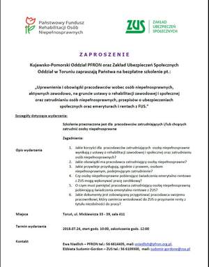 Przypominamy, że już w najbliższy wtorek, tj. 24.07.2018r., o godz. 10:00 w siedzibie ZUS w Toruniu, odbędzie się szkolenie, organizowane przez Kujawsko-Pomorski Oddział PFRON i Toruński Oddział ZUS, przeznaczone dla pracodawców zatrudniających i/lub chcących zatrudnić osoby niepełnosprawne nt.”Uprawnienia i obowiązki pracodawców wobec osób niepełnosprawnych, aktywnych zawodowo, na gruncie ustawy o rehabilitacji zawodowej i społecznej oraz zatrudnianiu osób niepełnosprawnych, przepisów o ubezpieczeniach społecznych oraz emeryturach i rentach z FUS.”