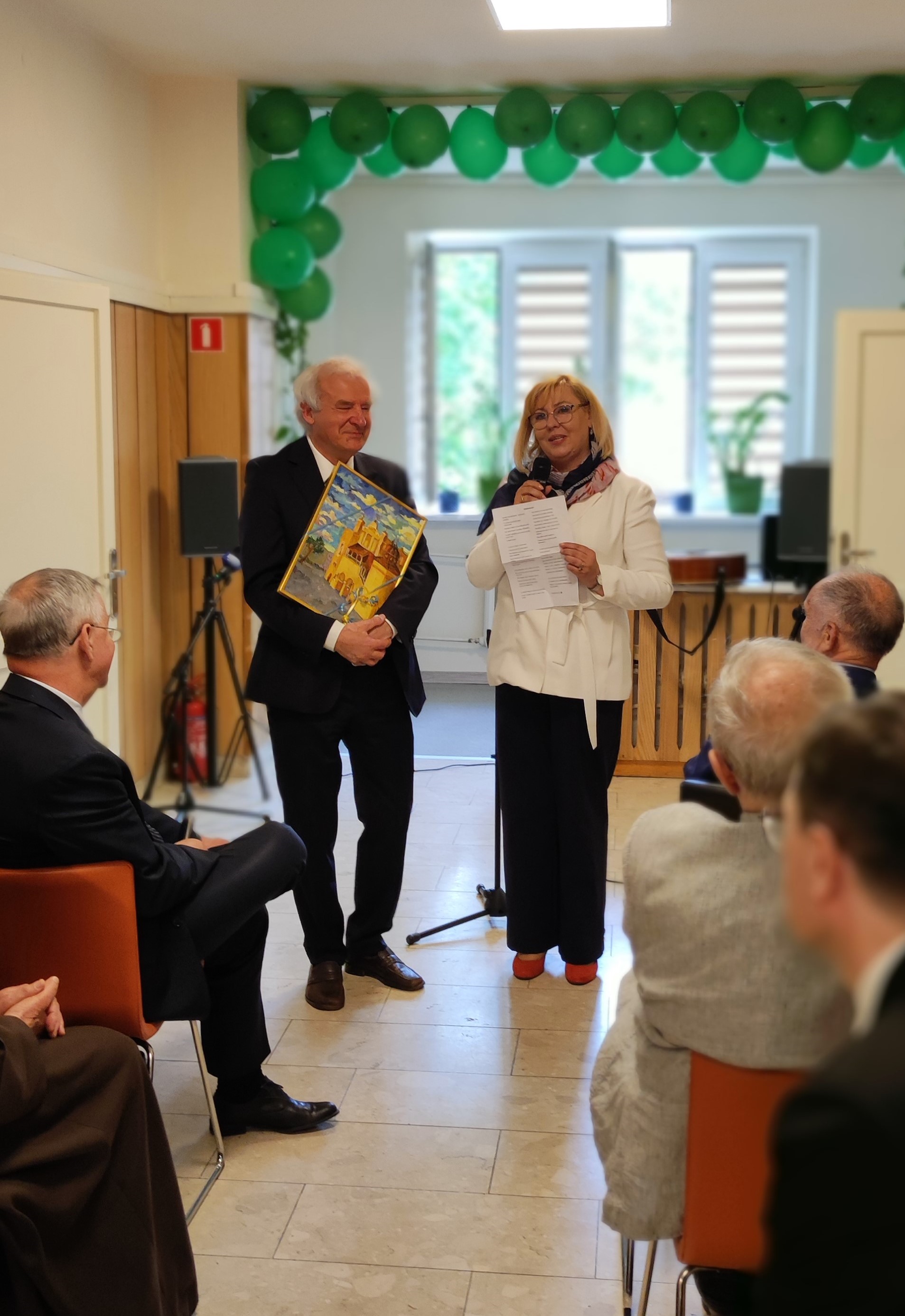 - Jak mawiał prof. Antoni Kępiński: "Kto nie buduje, musi burzyć". Pan całe życie buduje wspaniałe rzeczy! – dyrektor Marta Mordarska podziękowała prof. dr hab. n. med. Andrzejowi Cechnickiemu za zaangażowanie w pracę na rzecz seniorów i osób z niepełnosprawnościami. Gratulując dotychczasowych osiągnięć Stowarzyszenia, na ręce Profesora Cechnickiego przekazała obraz wykonany przez artystów z Fundacji Sztuki Osób Niepełnosprawnych w Krakowie.