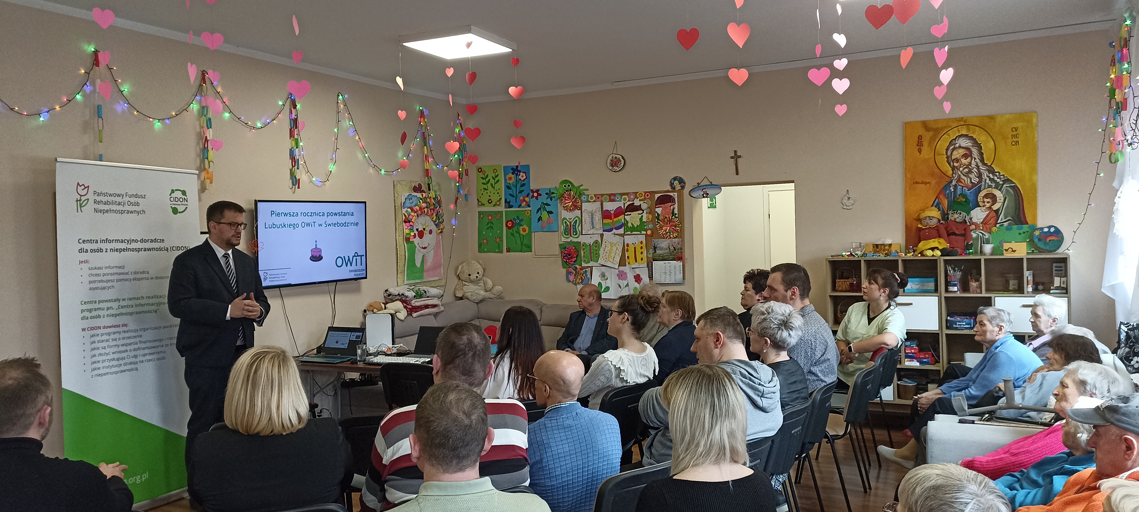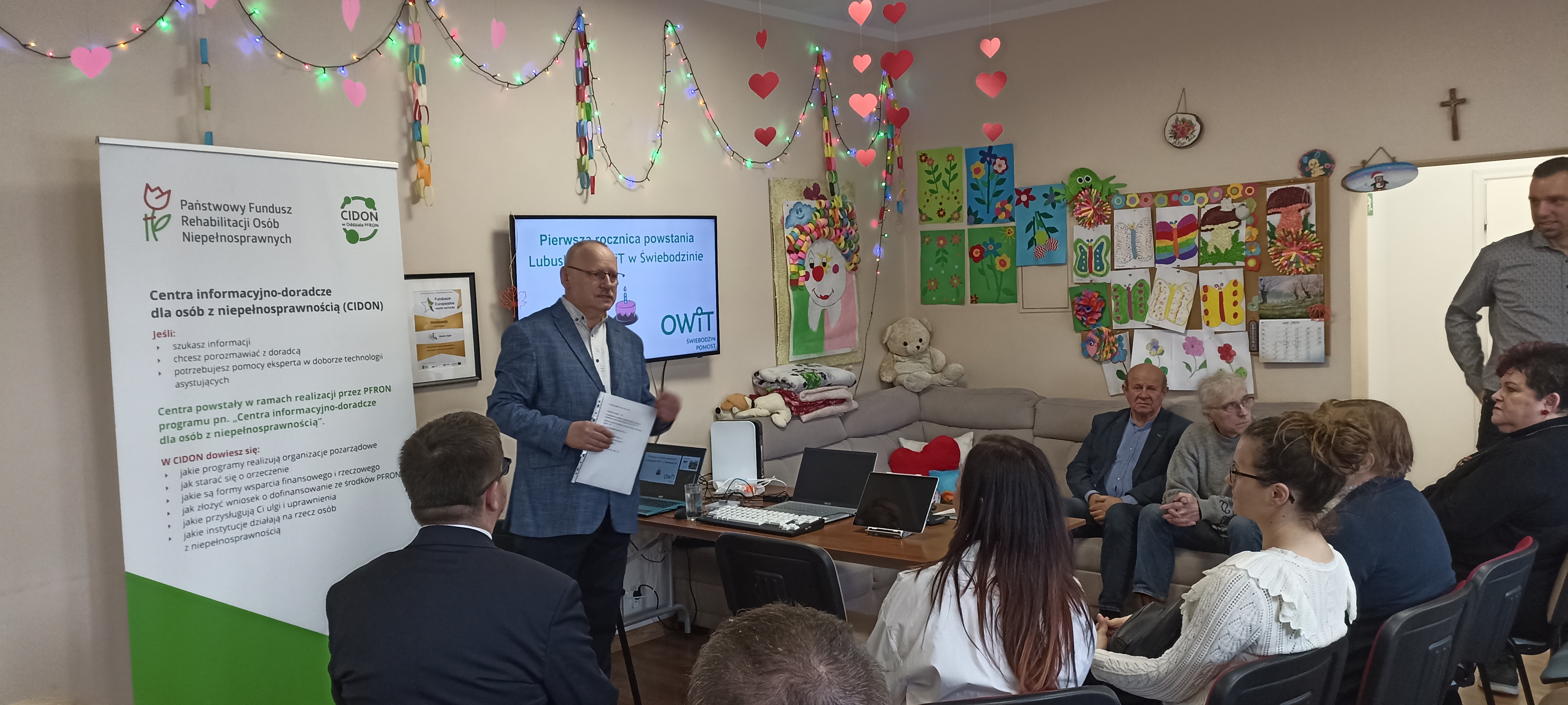 Dziś podczas uroczystego spotkania w Domu Dziennego Pobytu „Homini” w Świebodzinie Prezes Stowarzyszenia na Rzecz Edukacji „Pomost” Jan Kostyszak przedstawił działalność OWiT w ciągu roku. Działalność OWiT nie byłaby możliwe gdyby nie wsparcie PFRON, dlatego Dyrektor Oddziału Lubuskiego PFRON Andrzej Gonia zapewnił o kontynuowaniu współpracy pomiędzy Oddziałem a Stowarzyszeniem „Pomost”. Głos zabrał również Burmistrz Świebodzina Tomasz Sielicki, który podziękował Ośrodkowi za działalność na rzecz osób z niepełnosprawnościami w Gminie Świebodzin. Na koniec Wiceprezes Stowarzyszenia „Pomost” Bartosz Jażdżewski z OWiT w Świebodzinie zaprosił uczestników z niepełnosprawnościami do zaprezentowania sprzętu. Przedstawiono pokaz działania koncentratora tlenu i sprzętu elektronicznego.