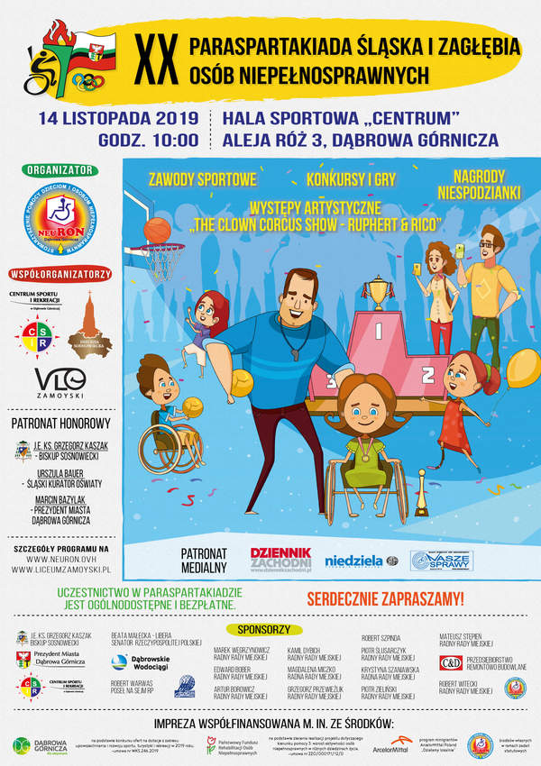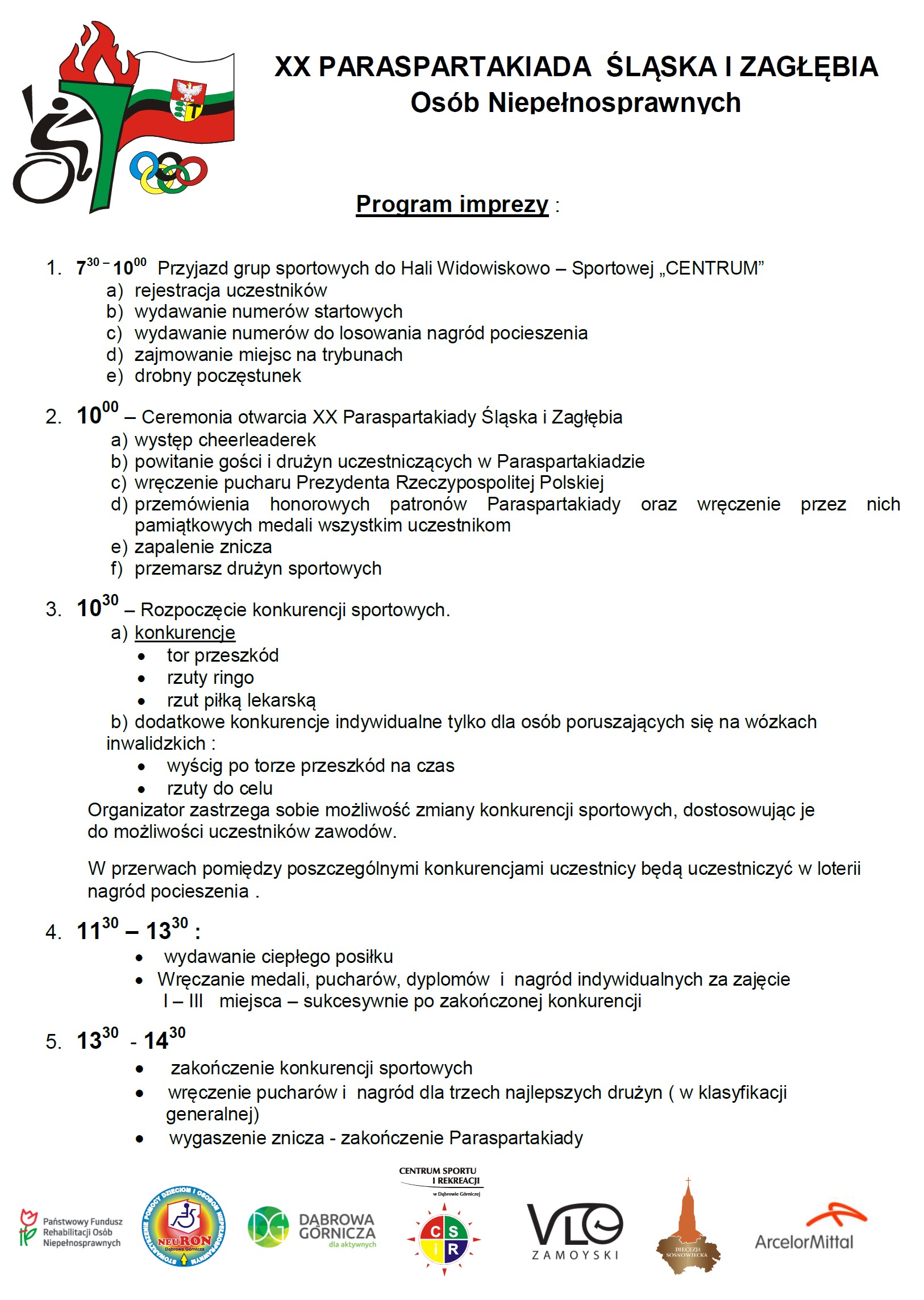 Już wkrótce kolejna impreza sportowo-integracyjna dla osób niepełnosprawnych. Tym razem w Dąbrowie Górniczej 14 listopada br. odbędzie jubileuszowa XX edycja Paraspartakiada Śląska i Zagłębia. Zawodnicy z czterech województw: śląskiego, opolskiego, małopolskiego i świętokrzyskiego powalczą o Puchar Prezydenta Rzeczpospolitej Polskiej. Wydarzenie rozpocznie się o godz. 10.00 w hali widowiskowo-sportowej "CENTRUM". Organizatorem jest Stowarzyszenie „Neuron” Pomocy Dzieciom i Osobom Niepełnosprawnym w Dąbrowie Górniczej.