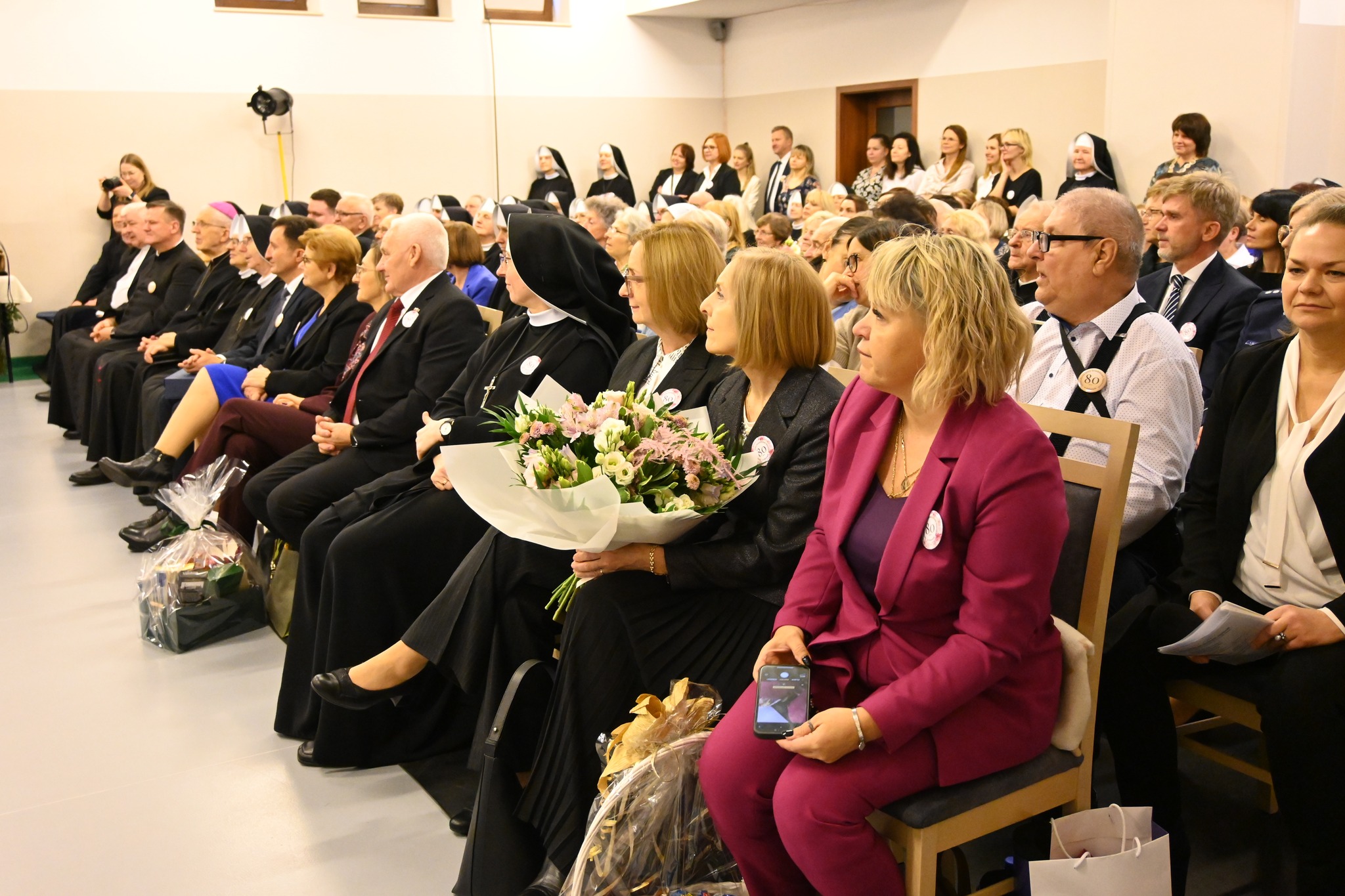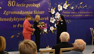 W wydarzeniu uczestniczyły także przedstawicielki Państwowego Funduszu Rehabilitacji Osób Niepełnosprawnych (PFRON), które podkreśliły znaczenie ośmiu dekad oddania i służby na rzecz potrzebujących. Obchody rozpoczęły się Mszą św. dziękczynną w parafii Miłosierdzia Bożego. Po liturgii zgromadzeni mieli okazję spotkać się z osobami, które przez lata były blisko Zgromadzenia — wychowankami, rodzinami, przyjaciółmi i współpracownikami. Na scenie wystąpiły utalentowane dzieci — ich prezentacje artystyczne dodały wydarzeniu blasku, wzruszeń i radości, stając się symboliczną ilustracją owoców wieloletniej pracy Sióstr. PFRON reprezentowały Panie: Agnieszka Kluś oraz Katarzyna Ostrzyżek. Przy tej okazji wręczyły Siostrom kwiaty oraz uroczysty grawerton z wyrazami głębokiej wdzięczności za niezwykłe dzieło, które od pokoleń niesie dobro, nadzieję i wsparcie osobom z niepełnosprawnościami oraz ich rodzinom. Podziękowania i gratulacje popłynęły również do wszystkich, którzy przez lata budowali to wyjątkowe dzieło — wychowawców, personelu placówek, rodziny, darczyńców i wolontariuszy. Od przybycia do Puław w 1945 roku, Siostry Benedyktynki Misjonarki nieustannie angażowały się w budowanie społeczności opartej na wsparciu, godności i solidarności. W ciągu ośmiu dekad utworzyły i prowadziły m.in.: Specjalny Ośrodek Wychowawczy im. s. Klary Staszczak, Niepubliczną Szkołę Specjalną Przysposabiającą do Pracy oraz Ośrodek Rewalidacyjno-Wychowawczy. To właśnie tam dzieci, młodzież i dorośli z niepełnosprawnościami znaleźli opiekę, edukację, terapię i życzliwe wsparcie. Dzisiejsze święto to okazja do podkreślenia, jak wiele dobra zostało zbudowane — często w ciszy, bez rozgłosu — a także wyraz wdzięczności za nieustanną gotowość do niesienia pomocy.