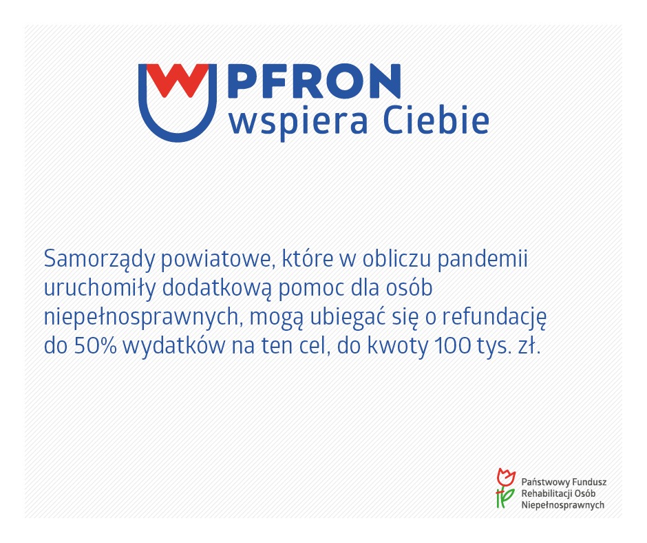 Oddział Małopolski PFRON przypomina, że w ramach programu PFRON, dedykowanego przeciwdziałaniu skutkom pandemii, przewidziana jest również pomoc dla samorządów powiatowych, które w związku z wystąpieniem sytuacji kryzysowych wywołanych chorobami zakaźnymi uruchomiły dodatkowe wsparcie dla osób niepełnosprawnych. Pomoc ta udzielana jest w formie refundacji części wydatków poniesionych przez samorządy powiatowe.