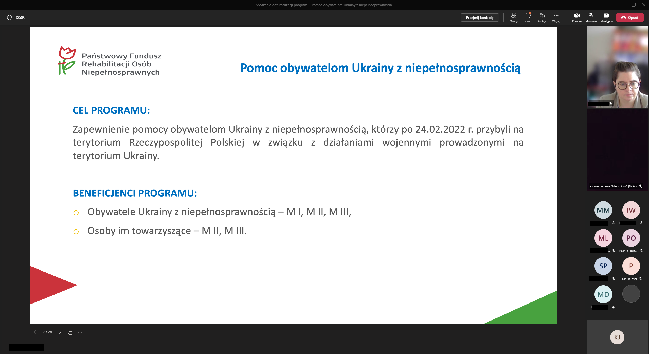 Marta Mordarska - dyrektor Małopolskiego Oddziału PFRON powitała uczestników spotkania i podziękowała za gotowość wsparcia uchodźców, w szczególności osób z niepełnosprawnościami. W spotkaniu udział wzięli zainteresowani realizacją programu PFRON przedstawiciele małopolskich jednostek samorządu terytorialnego, MOPS-ów, PCPR-ów oraz organizacji pozarządowych.