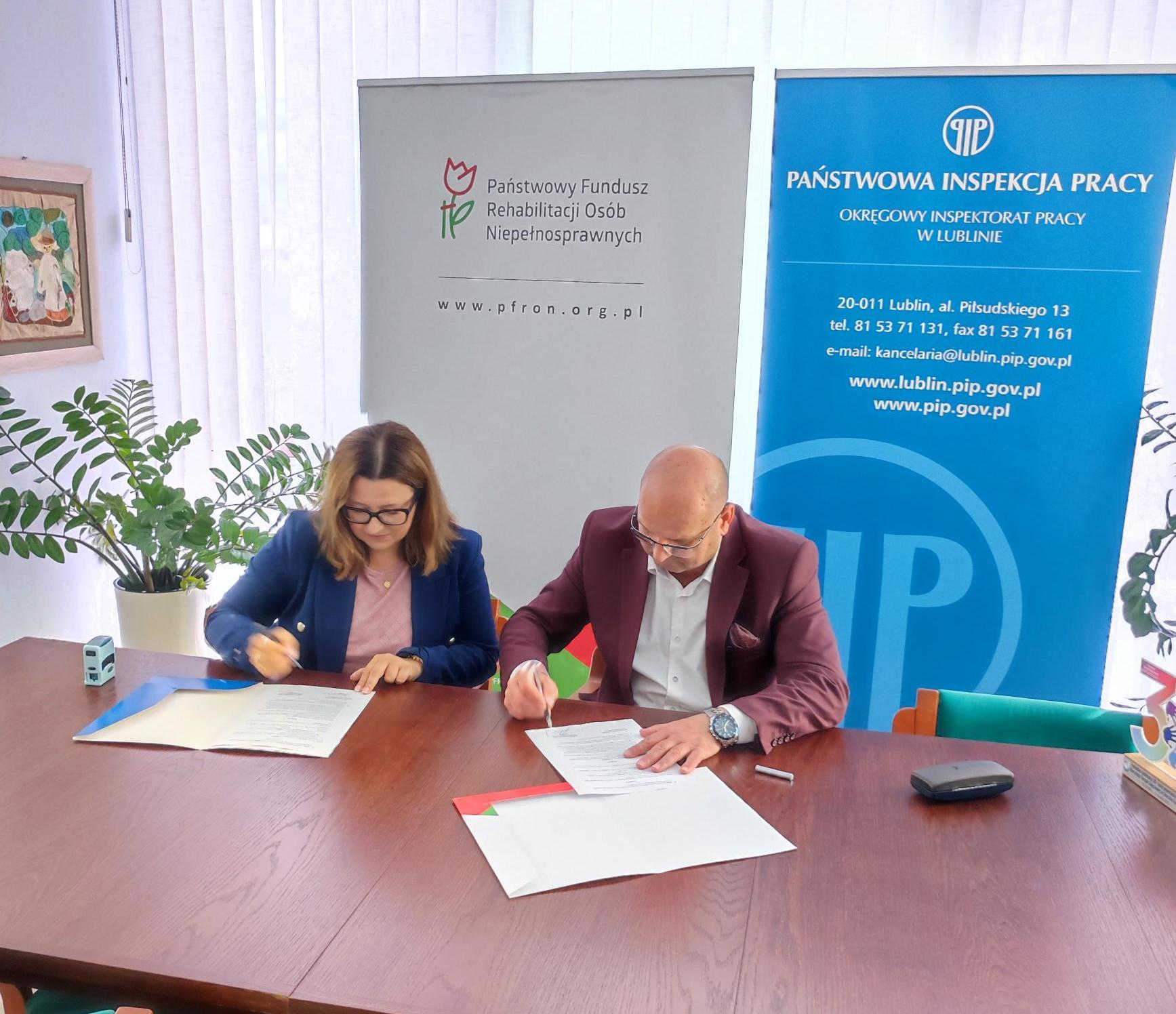 Dokument sygnowali: Dyrektor Oddziału Lubelskiego PFRON Monika Wac oraz Okręgowy Inspektor Pracy Włodzimierz Biaduń.