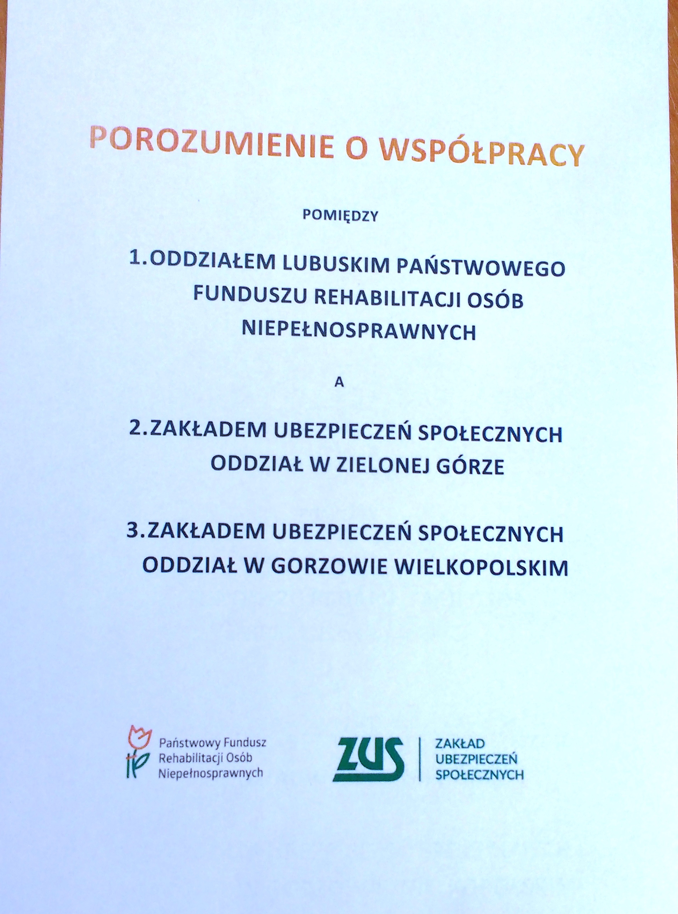 Ze strony ZUS dokument podpisali: Dyrektor ZUS Oddział w Gorzowie Wlkp. Dariusz Obiegło oraz Dyrektor ZUS w Zielonej Górze Piotr Burtowski, a ze strony Funduszu Dyrektor Oddziału Lubuskiego Andrzej Gonia. Tym samym ZUS stał się kolejnym, po TVP3 Gorzów Wlkp., Uniwersytecie Zielonogórskim i OHP oficjalnym partnerem PFRON w Lubuskiem.
