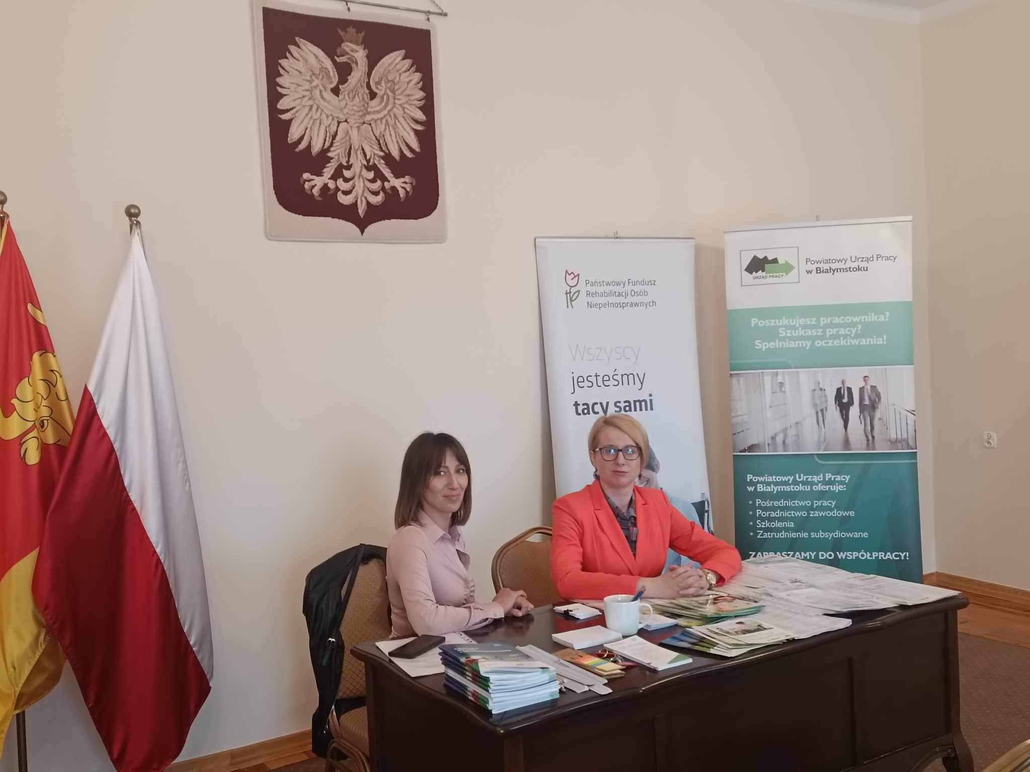 W ramach wspólnego dyżuru w Tykocinie, pracownicy Oddziału Podlaskiego Państwowego Funduszu Rehabilitacji Osób Niepełnosprawnych i Powiatowego Urzędu Pracy w Białymstoku przekazywali zainteresowanym osobom informacje na temat: