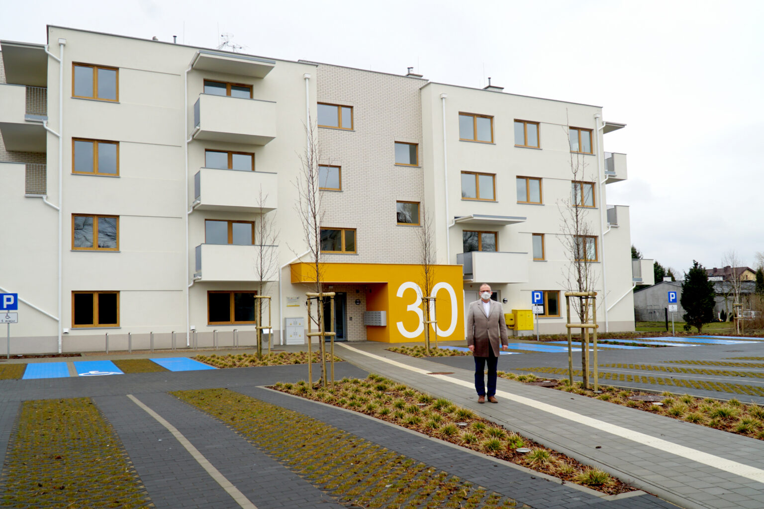 Na parkingu przed budynkiem, który powstał zgodnie z zapisami miejscowego planu zagospodarowania przestrzennego wyodrębniono osiem miejsc dla osób z niepełnosprawnościami. Jest też zieleń – posadzono drzewa, a tam, gdzie zastosowano nawierzchnię ażurową, posiana została trawa.