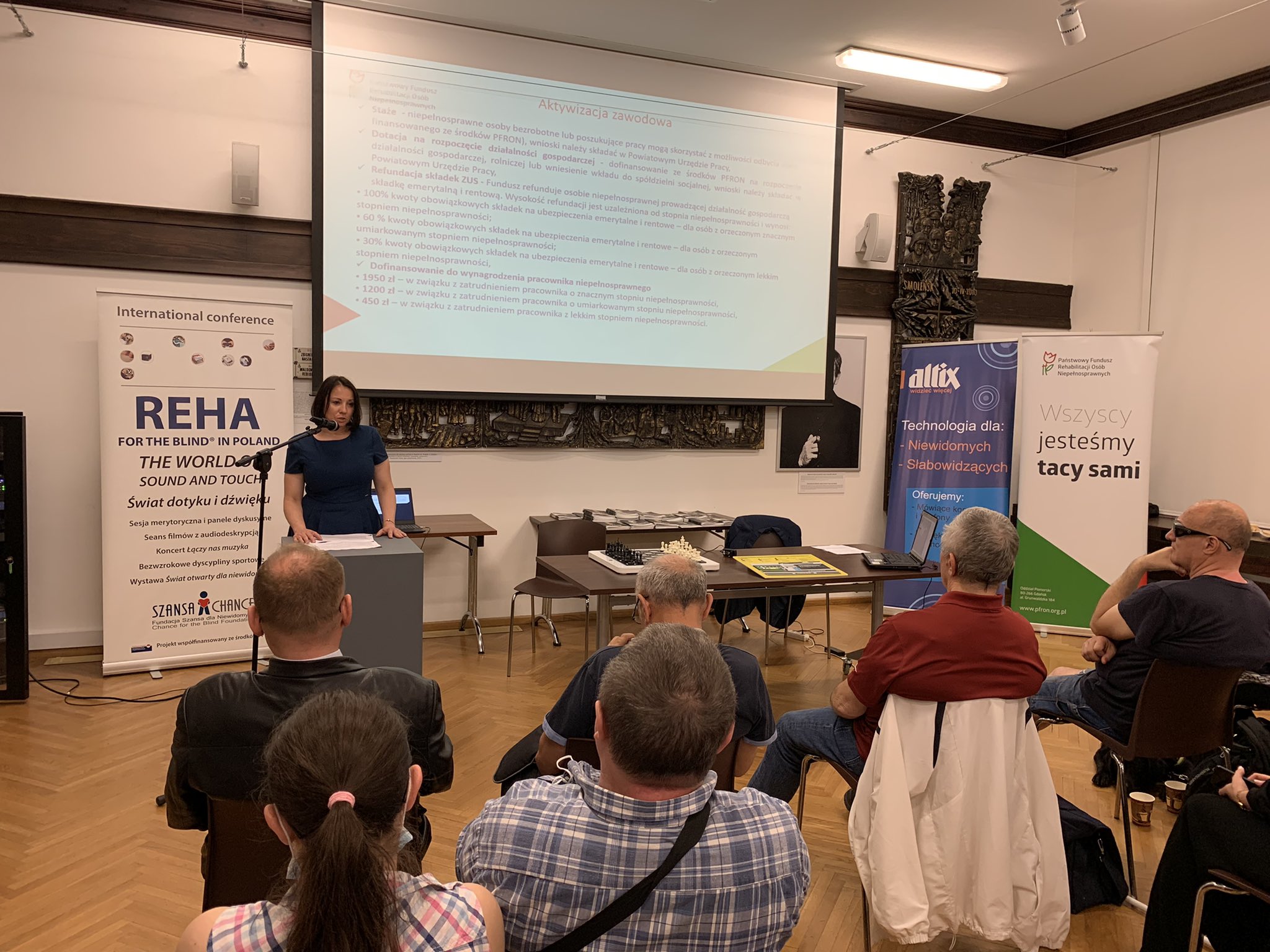 Przedstawicielka Oddziału Pomorskiego PFRON Anna Ciszewska wspólnie Agnieszką Parulską oraz Wasielewską Justyną z MOPR w Gdańsku zaprezentowały różne formy wsparcia dla osób niewidomych i niedowidzących w ramach programów, i zadań ustawowych realizowanych z środków PFRON. Omówiły zagadnienia dotyczące szeroko pojętej dostępności oraz wskazały działania, które są podejmowane w tym obszarze na rzecz osób z różnymi niepełnosprawnościami, w województwie pomorskim.