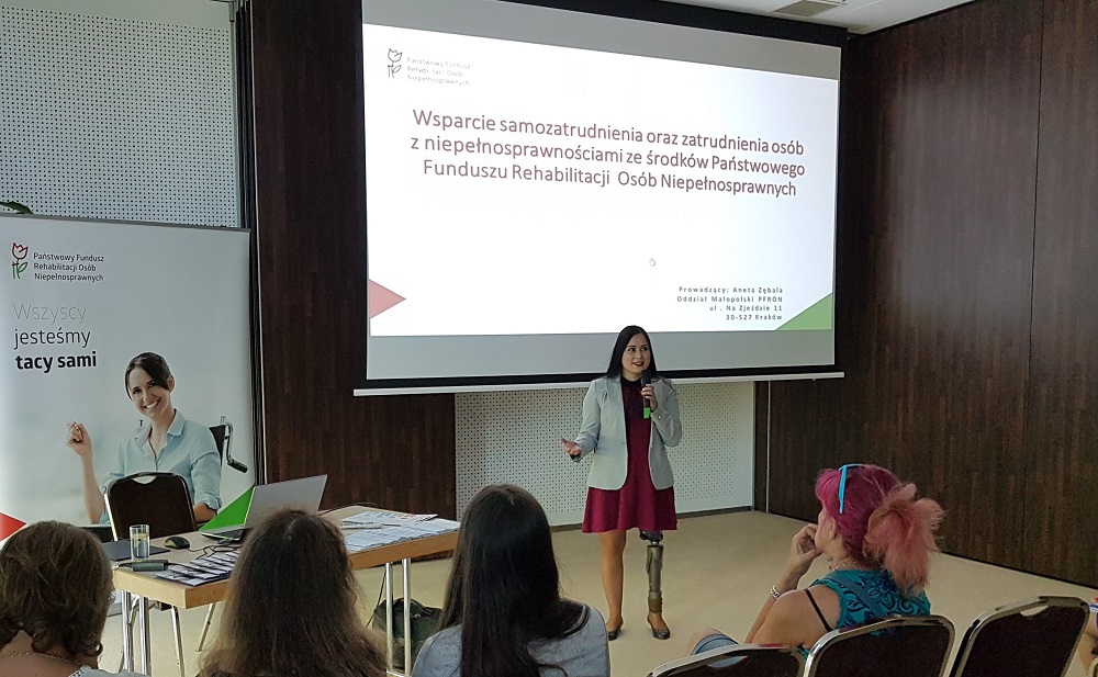 Stażystka Oddziału Małopolskiego Klaudia Kaniewska – uczestniczka pilotażowego programu PFRON pn. „Absolwent” przedstawiła korzyści z udziału w programie od momentu zaplanowania i wdrożenia indywidualnej ścieżki kariery zawodowej, poprzez podnoszenie kwalifikacji zawodowych, odbycie stażu oraz wsparcie przy poszukiwaniu pracy. Mówiono o stażach jako formie aktywizacji zawodowej osób bezrobotnych, umożliwiającej uzyskanie doświadczenia zawodowego oraz o podjęciu zatrudnienia po odbyciu stażu. Pracodawcy opowiedzieli o dobrych praktykach w zatrudnianiu osób niepełnosprawnych, właśnie po odbytych stażach. Pracownik, który został zatrudniony w ten sposób, przedstawił swoją historię w wystąpieniu „Od stażysty do pracownika”.