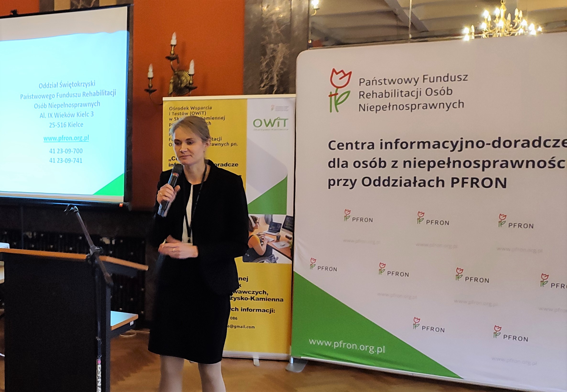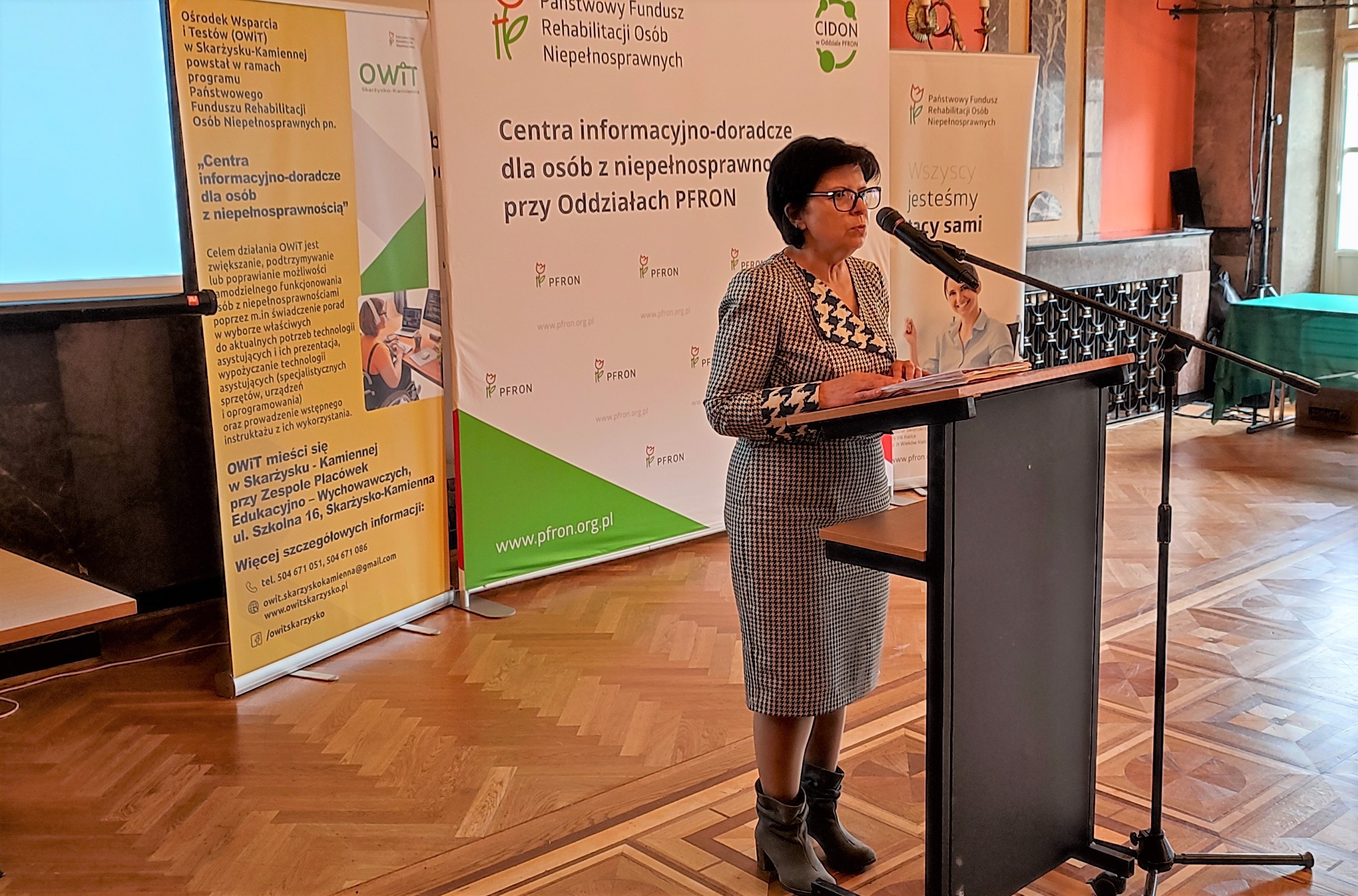 Budowaniu sieci współpracy w ramach modułu CIDON było poświęcone spotkanie zorganizowane 5 grudnia br. przez Oddział Świętokrzyski PFRON. W spotkaniu w Wojewódzkim Domu Kultury w Kielcach wzięło udział blisko sto osób z terenu całego województwa. Gościliśmy przedstawicieli: PCPR-ów, Urzędów Pracy, Poradni Psychologiczno-Pedagogicznych, Specjalistycznych Ośrodków Szkolno-Wychowawczych oraz Biur Karier. Wśród wielu zaproszonych gości obecni byli m.in.: dyrektor Departamentu ds. Współpracy z Organizacjami Pozarządowymi PFRON Kamil Bobek, senator Krzysztof Słoń, Kamila Zabielska – Niedbała naczelnik Wydziału Organizacyjnego NFZ, Małgorzata Popiel zastępca Dyrektora Oddziału Kieleckiego ZUS i wielu innych. Zebranych powitał dyrektor Oddziału Świętokrzyskiego PFRON Andrzej Michalski. Zanim rozpoczęła się konferencja odbyła się gala nagrody „Świętokrzyscy Burzycieli Barier im. Anny Sowy” - podczas której osobom likwidującym bariery, zarówno te architektoniczne, jak i mentalne wręczono wyróżnienia i statuetki, które otrzymali: W kategorii „Łatwy Dostęp” – kapituła wyróżniła LO im. Kardynała Stefana Wyszyńskiego ze Staszowa oraz Urząd Gminy Strawczyn. Statuetkę przyznano Spółdzielni Mieszkaniowej „Wanacja” ze Starachowic. W kategorii „Skuteczna Komunikacja” wyróżniono Miejską Bibliotekę Publiczną im. J. Pilcha w Kielcach, a statuetkę wręczono przedstawicielom Starostwa Powiatowego w Skarżysku -Kamiennej. W ostatniej kategorii „Przyjaciel Osób Niepełnosprawnych” wyróżniona została Agnieszka Zaczkowska – dyrektor SOSW w Jędrzejowie oraz Krzysztof Korpik ze Starachowic. Statuetkę wręczono Pawłowi Solarzowi – dziennikarzowi Radia Kielce. Po gali rozpoczęła się oficjalna część konferencji. Jako pierwszy głos zabrał dyrektor Kamil Bobek, który mówił o „Zmianach wprowadzonych w 2022 roku do warunków konkursów o zlecenie realizacji zadań ogłoszonych przez PFRON na podstawie art. 36 ustawy o rehabilitacji. Kolejne dwa wystąpienia należały do przedstawicielek NFZ oraz ZUS, które mówiły o działaniach tych instytucji wspierających osoby z niepełnosprawnością. W drugiej części spotkania pracownicy Oddziału Świętokrzyskiego PFRON przybliżyli działania Centrów Informacyjno-Doradczych dla Osób z Niepełnosprawnością (CIDON). Podczas konferencji przedstawiciele ZPSW ze Skarżyska-Kamiennej dyrektor Marcin Kruk i Paweł Garbuzik kierownik OWiT przedstawili działalność kierowanych przez nich placówek. Pan Garbuzik zachęcał do przekazywania informacji o działalności Ośrodka Wsparcia i Testów oraz do wypożyczania sprzętu przeznaczonego dla osób z niepełnosprawnościami. O założeniach programu „Samodzielność-Aktywność- Mobilność” Mieszkanie dla Absolwenta i Dostępne Mieszkanie mówiła Magda Karyś, a o Kompletnej Rehabilitacji Żaneta Oczeretko pracownice Oddziału Świętokrzyskiego PFRON. Podczas konferencji można było zadawać pytania, z czego chętnie korzystano. Wydarzenie uświetnił swoim występem zespół z Zespołu Placówek Edukacyjno-Wychowawczych ze Skarżyska-Kamiennego.
