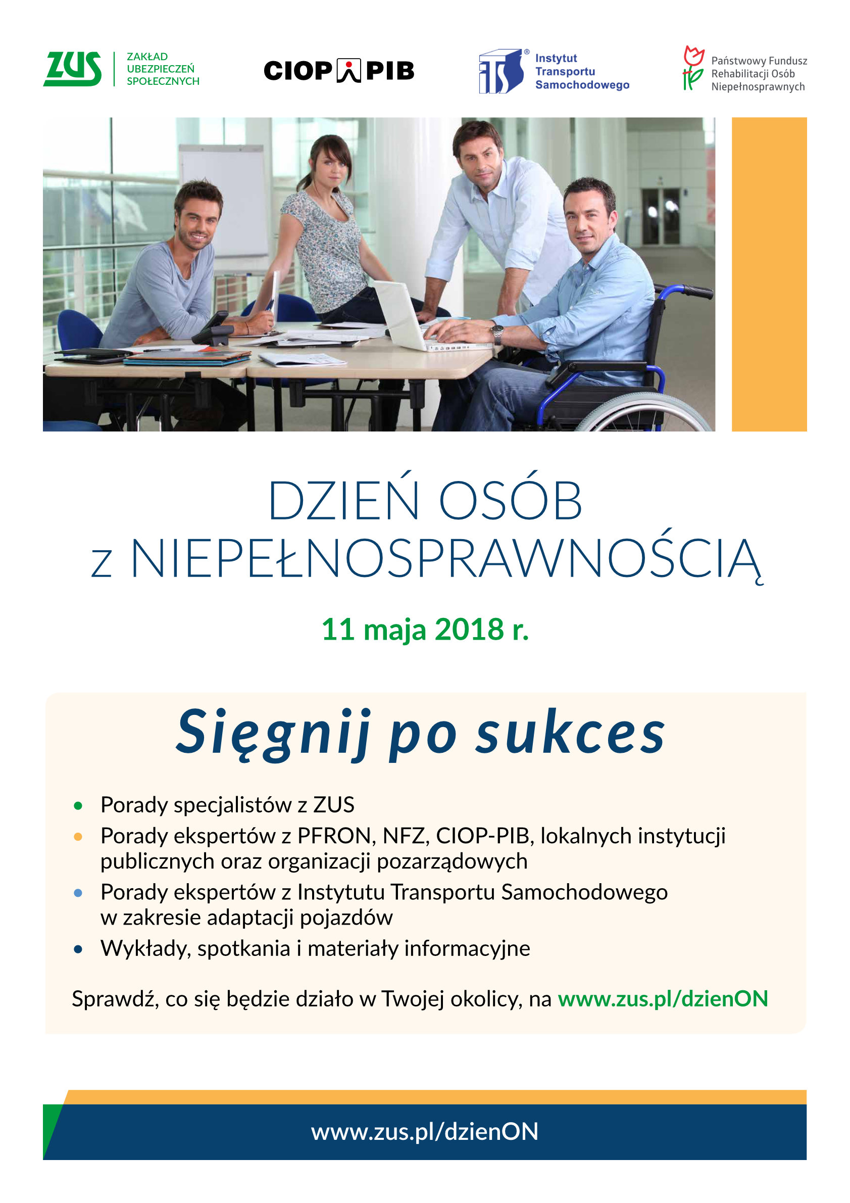 W tym roku Zakład Ubezpieczeń Społecznych organizuje Dzień Osób z Niepełnosprawnością, pod hasłem „Sięgnij po sukces”. Tego dnia, w placówkach ZUS i w innych instytucjach do pobrania będą ciekawe publikacje, m.in. Savoir-vivre wobec osób z niepełnosprawnością czy Jak żyć na wózku? Dodatkowo w różnych punktach w Warszawie przewidziane są spotkania, wykłady i porady lokalnych instytucji publicznych i organizacji pozarządowych (szczegółowy harmonogram na stronie www.zus.pl).