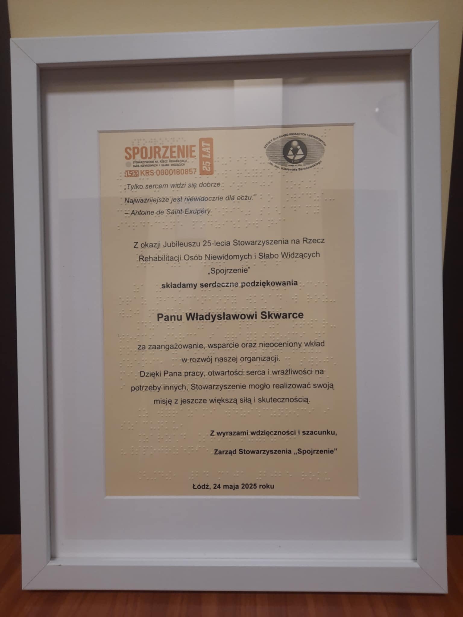W czasie uroczystości dyrektor Łódzkiego Oddziału PFRON Władysław Skwarka został wyróżniony za zaangażowanie, wsparcie oraz nieoceniony wkład w rozwój Stowarzyszenia „Spojrzenie”.