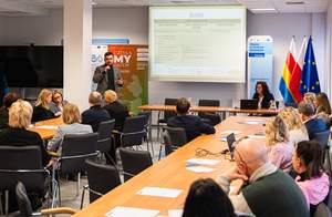 2. Możliwości wsparcia w ramach Funduszy Europejskich dla Podlaskiego 2021–2027. Przedstawicielka Głównego Punktu Informacyjnego Funduszy Europejskich w Białymstoku – Izabela Lasota – przedstawiła ofertę kierowaną do podmiotów ekonomii społecznej w ramach Europejskiego Funduszu Społecznego Plus. Zaprezentowała aktualne i nadchodzące nabory, a także praktyczne wskazówki dotyczące aplikowania.