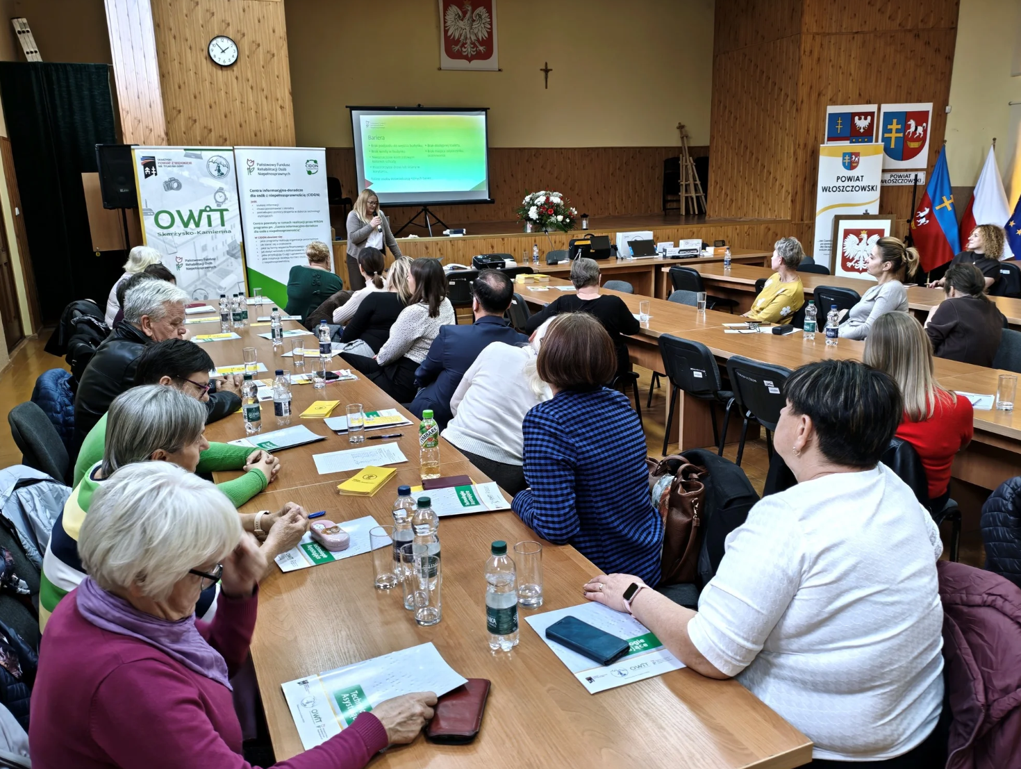 14 listopada br. pracownicy Oddziału Świętokrzyskiego Państwowego Funduszu Rehabilitacji Osób Niepełnosprawnych zorganizowali wraz ze Starostem Powiatowym we Włoszczowie spotkanie informacyjne. Wśród zaproszonych gości byli przedstawiciele Ośrodka Wsparcia i Testów ze Skarżyska Kamiennej. Spotkanie odbyło się w sali konferencyjnej Starostwa Powiatowego we Włoszczowie. W wydarzeniu wzięło udział kilkadziesiąt osób, wśród nich przedstawiciele poszczególnych gmin powiatu włoszczowskiego zajmujących się pomocą osobom z niepełnosprawnościami, a także podopieczni z okolicznych DPS-ów. Spotkanie miało charakter informacyjny i poświęcone było nowoczesnym rozwiązaniom technologicznym, które mogą znacząco ułatwić codzienne życie osób z niepełnosprawnościami, a także działaniom Centrum Informacji Doradczego dla osób z niepełnosprawnością. Jednym z głównych punktów spotkania było przybliżenie działalności Centrum Informacyjno – Doradczego dla osób z niepełnosprawnością. Katarzyna Curyło z Oddziału Świętokrzyskiego PFRON przedstawiła zebranym działalność CIDON oraz odpowiadała na wszystkie pytania zainteresowanych osób. Marzena Kozieł z Oddziału Świętokrzyskiego PFRON wygłosiła prelekcję na temat „Jak korzystać z prawa do dostępności”. Paweł Garbuzik z Ośrodka Wsparcia i Testów w Skarżysku Kamiennej, zaprezentował program: „Wypożyczalnia technologii wspomagających dla osób z niepełnosprawnością” przedstawił zasady funkcjonowania OWIT i możliwości wsparcia jakim Ośrodek dysponuje