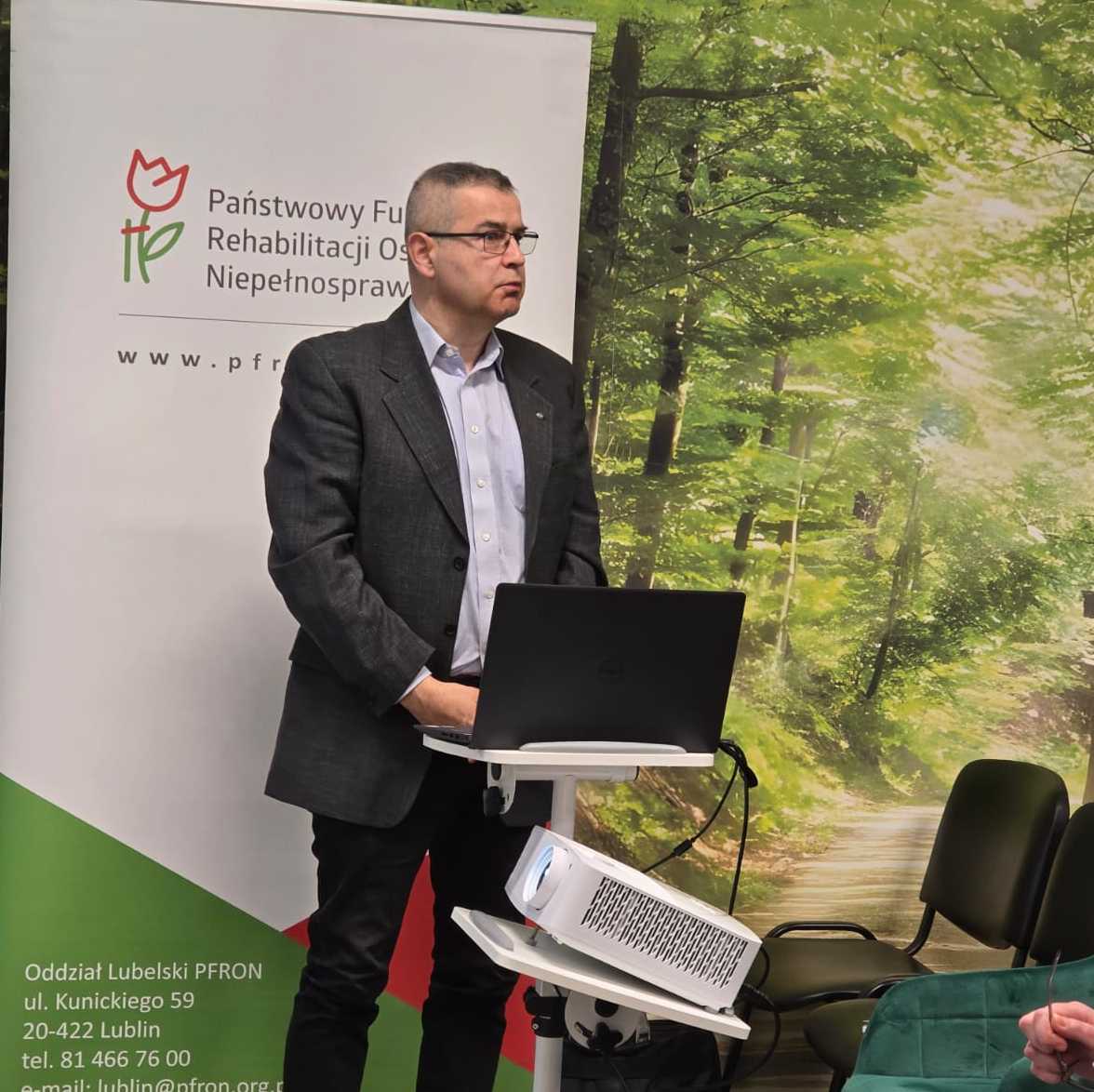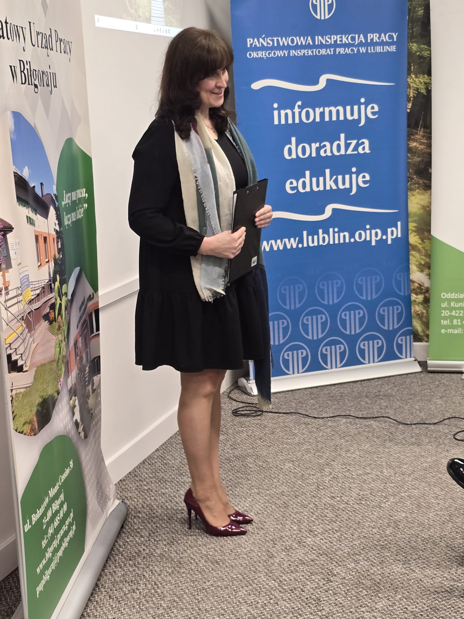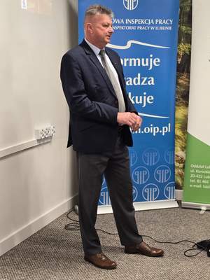 Artur Kornas, Kierownik Oddziału Państwowej Inspekcji Pracy w Zamościu, przedstawił wymagania dotyczące m.in. badań lekarskich, szkoleń BHP oraz dostosowania stanowisk pracy do potrzeb osób z niepełnosprawnościami. Zwrócił także uwagę na znaczenie ergonomii przy tworzeniu stanowisk komputerowych. - Prawna ochrona stosunku pracy