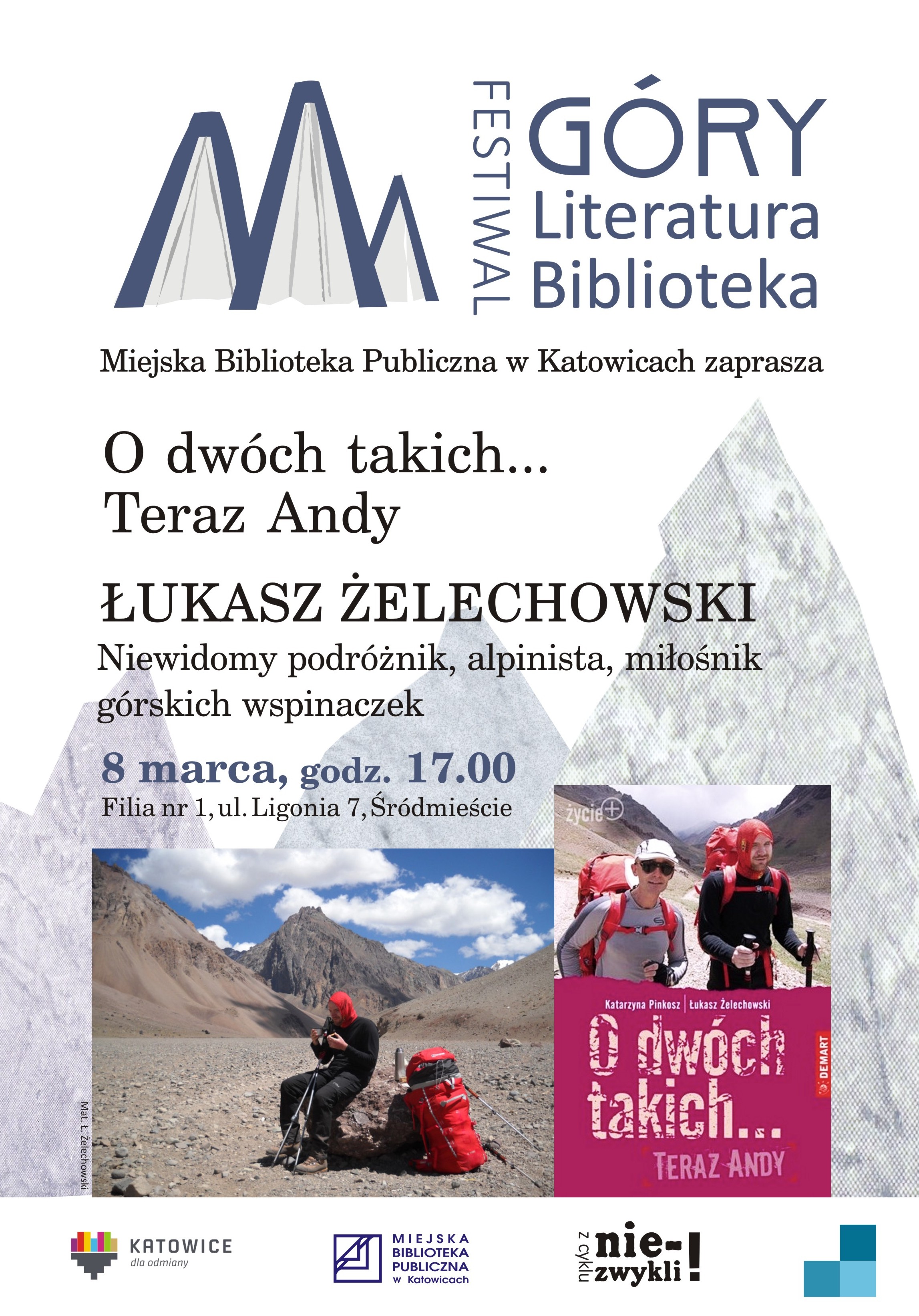 „O dwóch takich… Teraz Andy” to tytuł kolejnego spotkania w Miejskiej Bibliotece Publicznej w Katowicach. 8 marca br. bohaterem cyklu „Nie-zwykli!” i jednocześnie pierwszego festiwalu górsko-literackiego pod nazwą GÓRY – Literatura – Biblioteka będzie Łukasz Żelechowski. Niewidomy podróżnik opowie o swoim doświadczeniu gór, wspinaczkach na najwyższe szczyty i wielu innych pasjach, które realizuje na co dzień.