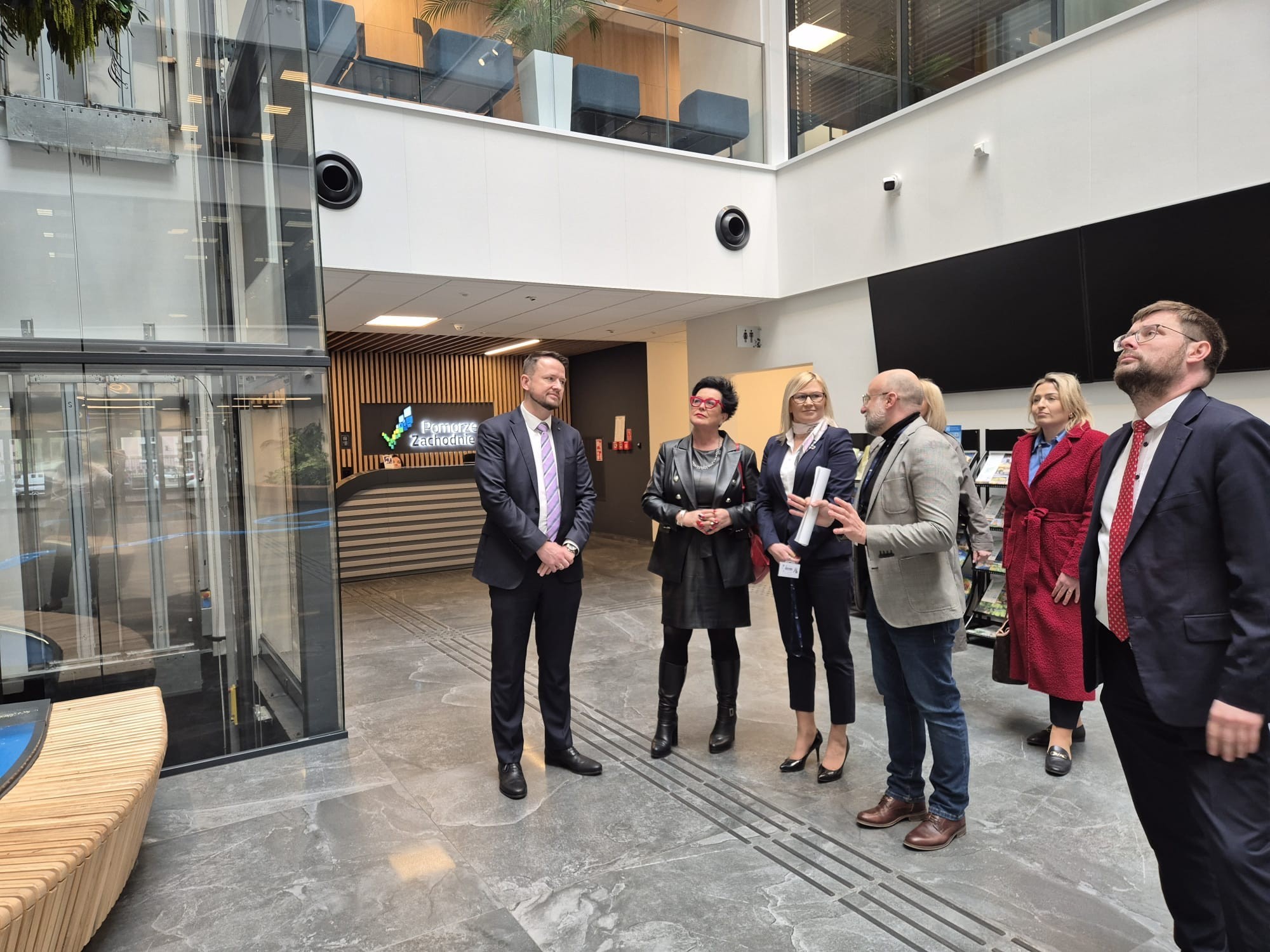 Delegacja z Państwowego Funduszu Rehabilitacji Osób Niepełnosprawnych miała również okazję obejrzeć nową siedzibę Zachodniopomorskiego Urzędu Marszałkowskiego. Miejsca zarówno dostosowanego do potrzeb osób z niepełnosprawnością, jak również energooszczędnego i przyjaznego środowisku.