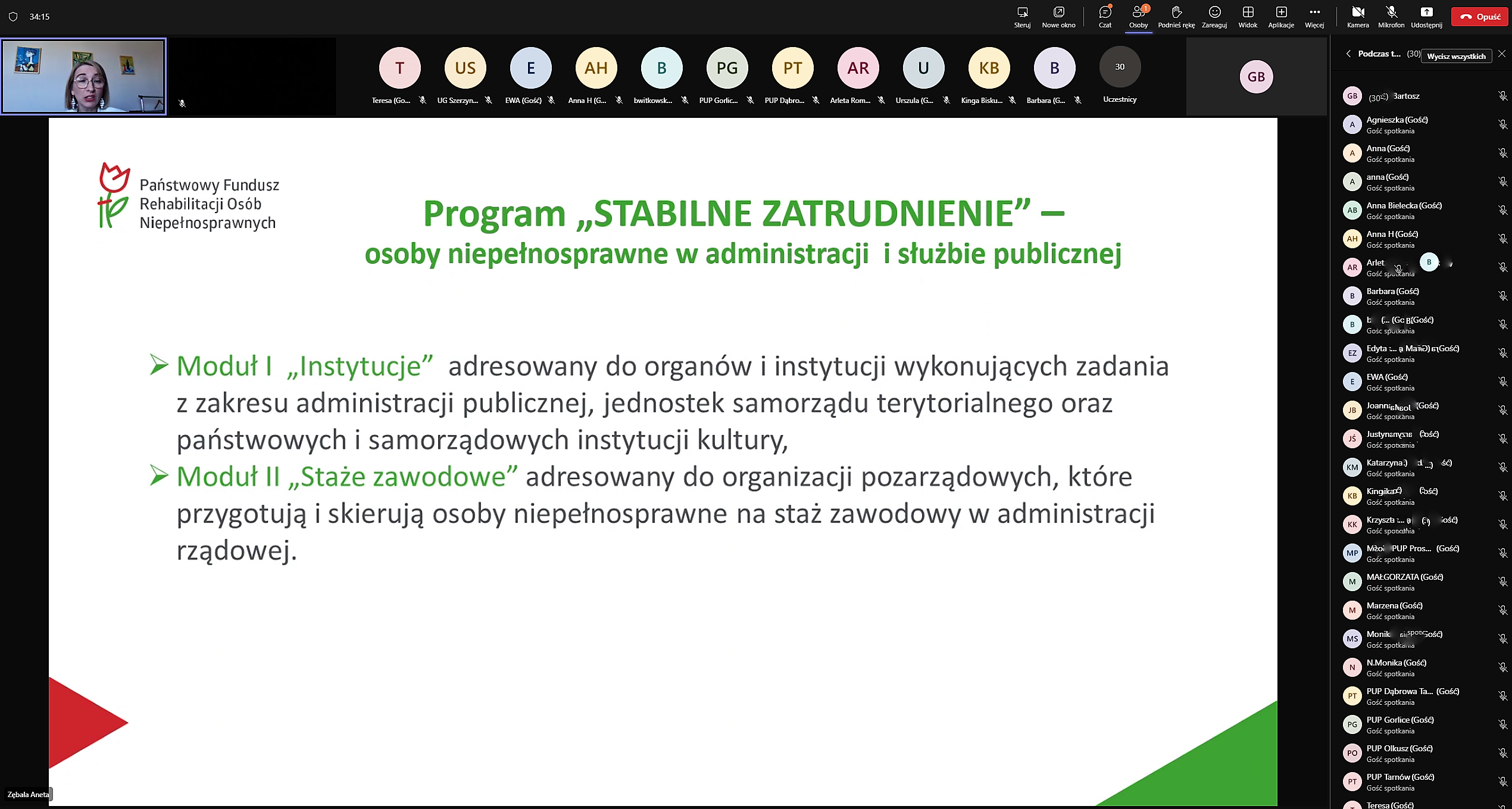 W dniu dzisiejszym Małopolski Oddział PFRON zorganizował webinarium na temat realizowanego przez PFRON programu „STABILNE ZATRUDNIENIE - osoby niepełnosprawne w administracji i służbie publicznej”.