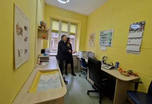 Pani Dyrektor została oprowadzona po gabinetach, w których wykonywane jest m.in. badanie słuchowych potencjałów wywołanych pnia mózgu — ABR. Badanie można wykonywać u wszystkich pacjentów, bez względu na wiek, jednak w szczególności należy je zrobić w przypadku podejrzenia niedosłuchu lub kiedy wynik badania słuchu przesiewowego jest negatywny. Odpowiednia diagnoza ubytku lub braku słuchu postawiona na wczesnym etapie pozwala dzieciom i młodzieży skorzystać z nowoczesnych rozwiązań w implantologii. To daje im możliwość rozwoju i życia z dużym ułatwieniem. Państwo Stromidło opowiedzieli jak wspaniałe efekty obserwują u pacjentów Poradni.
