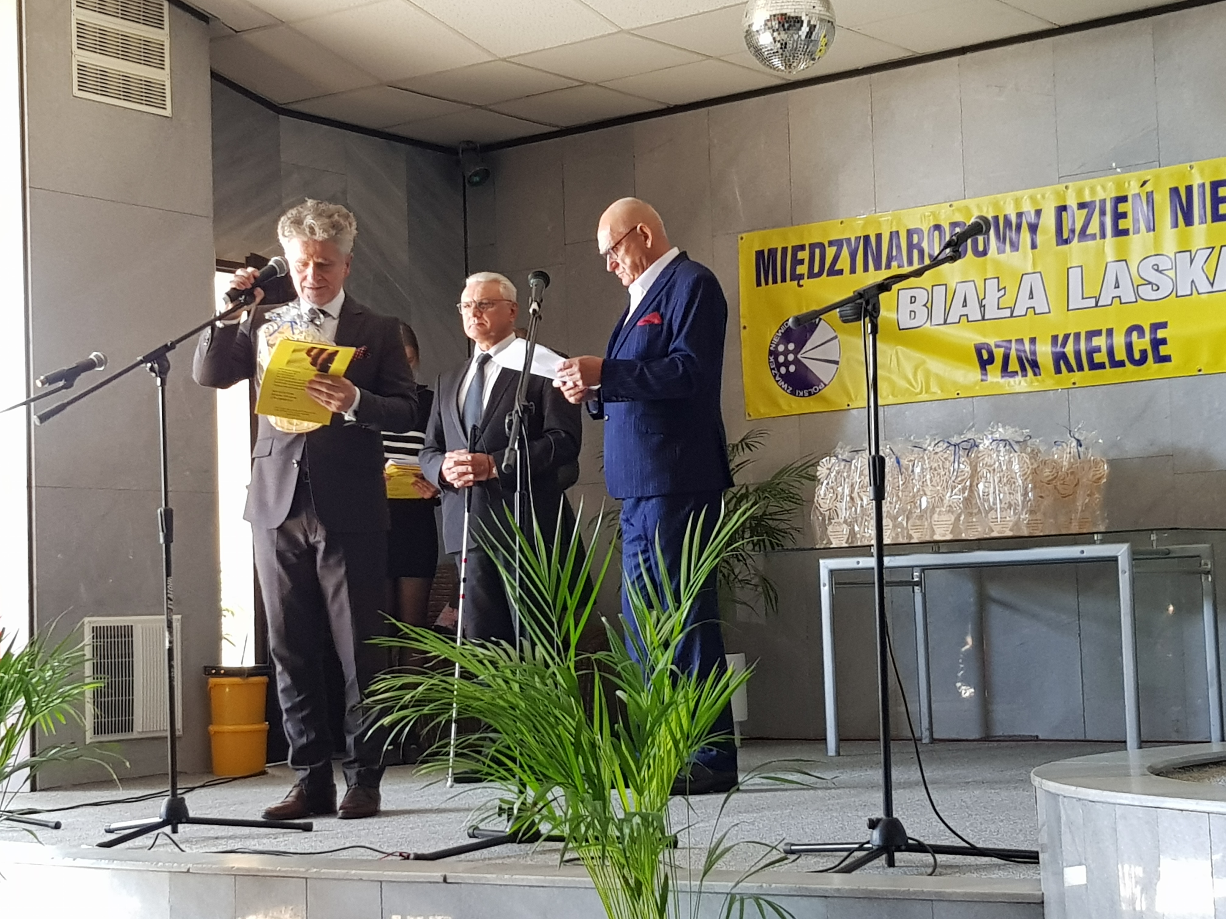 Obchody „Międzynarodowego Dnia Białej Laski” odbyły się w Kielcach 16 października br. Kieleckie uroczystości rozpoczęły się Mszą św. sprawowaną przez biskupa kieleckiego Jana Piotrowskiego w kościele pw. Św. Krzyża w Kielcach. Część oficjalna obchodów odbyła się w siedzibie SHL ZUGA. W uroczystościach wzięli udział m.in.: senator Krzysztof Słoń, Tomasz Pleban starosta kielecki, Bartłomiej Zapała wiceprezydent Kielc oraz przedstawiciel Oddziału Świętokrzyskiego PFRON, Władysław Burzawa. Licznie zebranych członków PZN oraz zaproszonych gości powitał prezes zarządu PZN Koło Kielce Marian Zakrzewski. Dziękował przedstawicielom władz za wsparcie którego osoby niewidzące i niedowidzące doświadczają z ich strony. Po wystąpieniach zaproszonych gości, w części artystycznej zespół: „Żeromszczyzna” zaśpiewał kilka regionalnych piosenek. Międzynarodowy Dzień Białej Laski to okazja do zwrócenia szczególnej uwagi na potrzeby i sytuację osób niewidomych i niedowidzących. Ten dzień pozwala na integrację osób niewidomych i niedowidzących z osobami pełnosprawnymi, otwiera ludzi na akceptację i empatię wobec osób niewidomych.