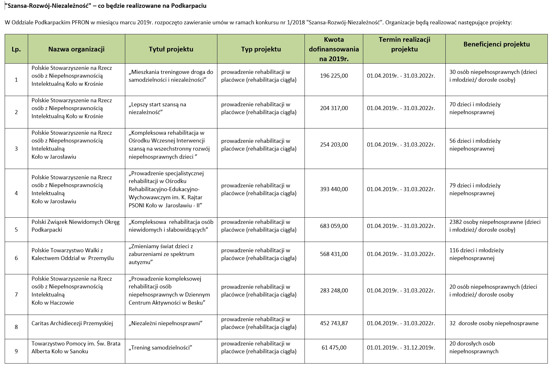 W Oddziale Podkarpackim PFRON w miesiącu marcu 2019r. rozpoczęto zawieranie umów w ramach konkursu nr 1/2018 "Szansa-Rozwój-Niezależność". Informacje na temat kto i jaki projekt będzie realizował zawiera poniższy załącznik.