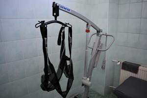 Konstrukcja urządzenia jest lekka i prosta do złożenia, a transport dodatkowo ułatwiają kółka. Sprzęt pozwoli wygodnie przenieść osobę z niepełnosprawnością, która porusza się na wózku także przy zabiegach higieniczno-pielęgnacyjnych . Nosidło wykonane zostało z szybkoschnącego materiału przepuszczającego wodę. Całość jest bardzo wytrzymała – z podnośnika mogą skorzystać także osoby o wadze do 150 kg.