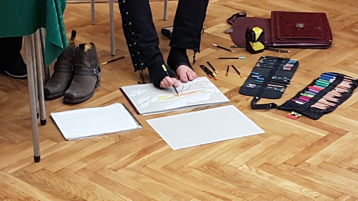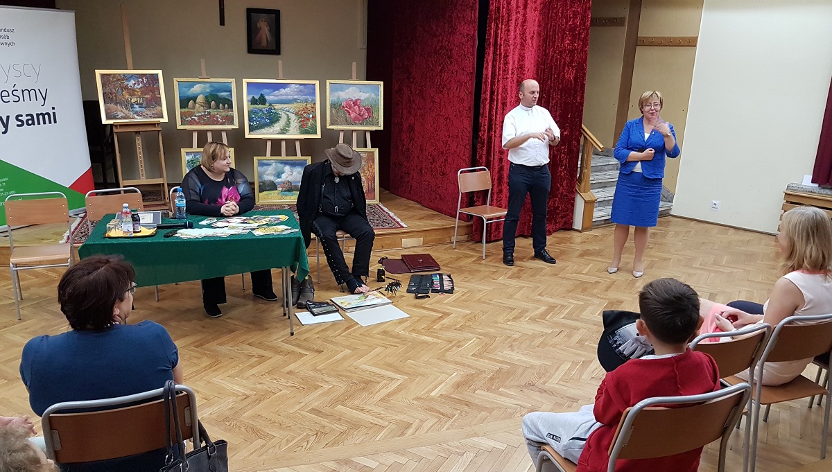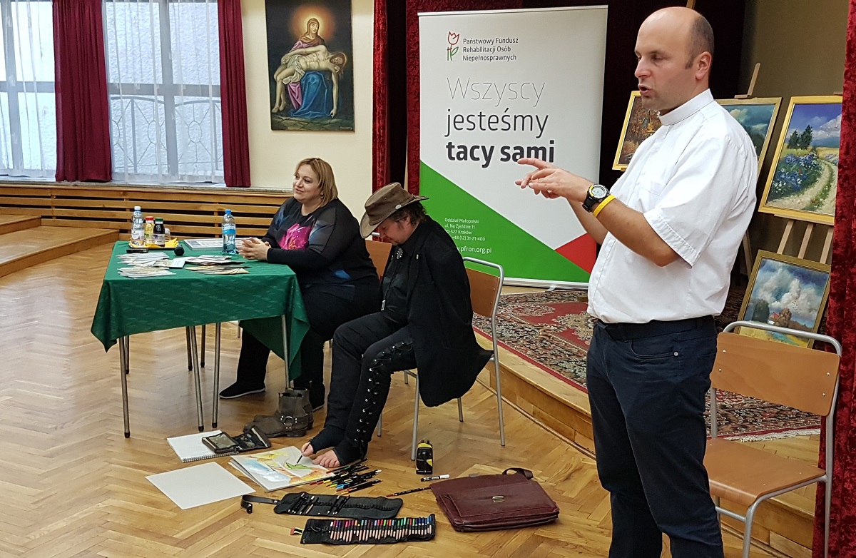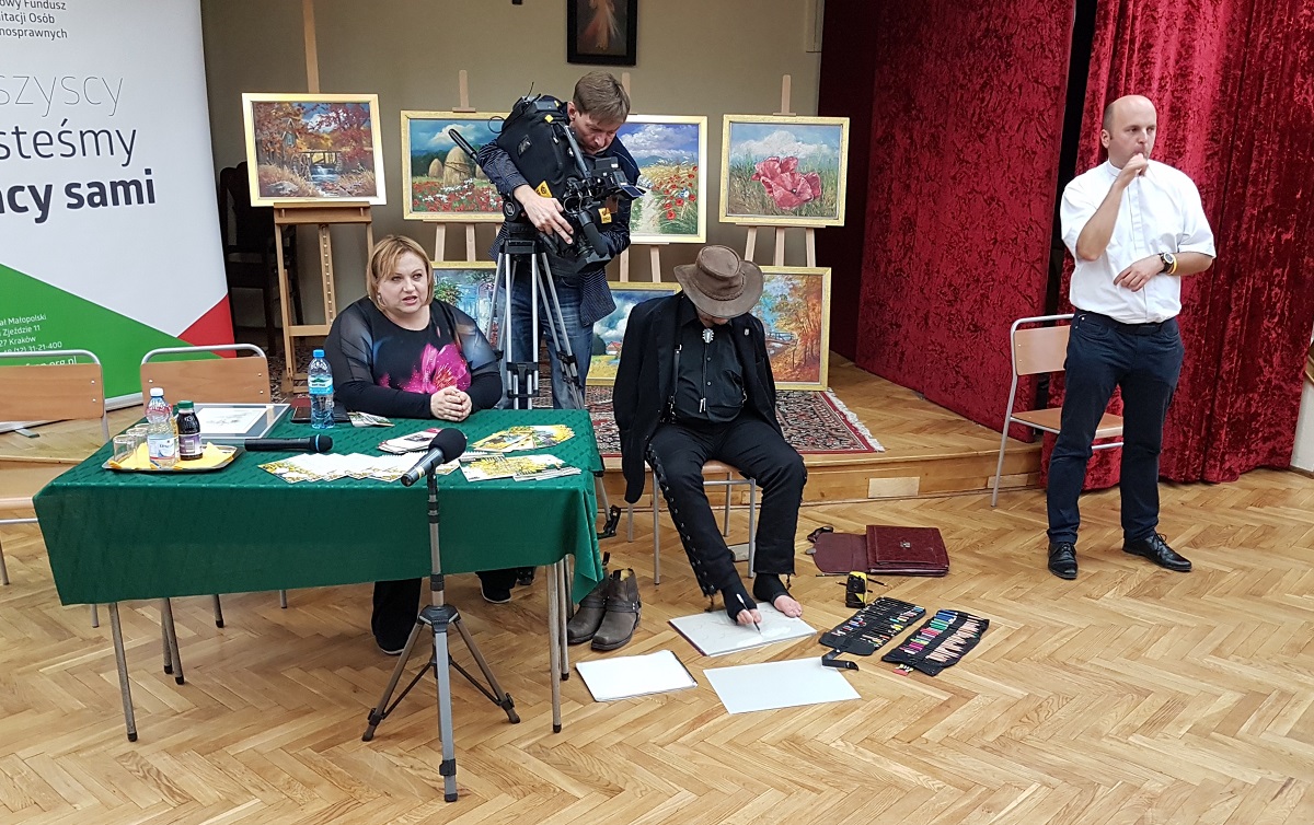 Z inicjatywy Marty Mordarskiej – dyrektor Małopolskiego Oddziału PFRON w ubiegły piątek odbyło się spotkanie z udziałem wyjątkowych gości. Artysta Stanisław Kmiecik – wyróżniony w tegorocznej edycji konkursu Lodołamacze w kategorii Lodołamacz Specjalny oraz jego Żona Monika Woszczyńska – Kmiecik opowiedzieli o przygodzie z malowaniem, życiu codziennym, radzeniu sobie z niepełnosprawnością oraz o pokonywaniu barier. Artysta krok po kroku zaprezentował swoją niezwykłą technikę malowania.